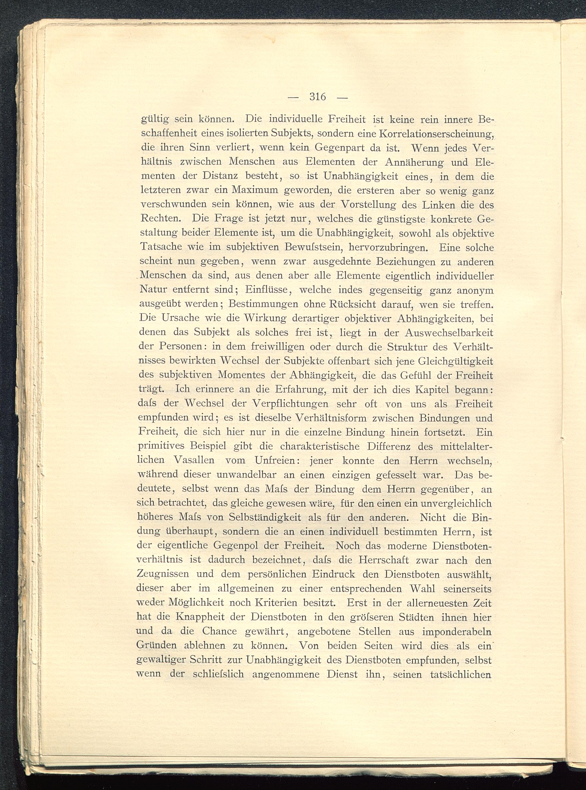 gültig sein können. Die individuelle Freiheit ist keine rein innere Be-schaffenheit eines isolierten Subjekts, sondern eine Korrelationserscheinung,die ihren Sinn verliert, wenn kein Gegenpart da ist. Wenn jedes Ver-hältnis zwischen Menschen aus Elementen der Annäherung und Ele-menten der Distanz besteht, so ist Unabhängigkeit eines, in dem dieletzteren zwar ein Maximum geworden, die ersteren aber so wenig ganzverschwunden sein können, wie aus der Vorstellung des Linken die desRechten. Die Frage ist jetzt nur, welches die günstigste konkrete Ge-staltung beider Elemente ist, um die Unabhängigkeit, sowohl als objektiveTatsache wie im subjektiven Bewufstsein, hervorzubringen. Eine solchescheint nun gegeben, wenn zwar ausgedehnte Beziehungen zu anderenMenschen da sind, aus denen aber alle Elemente eigentlich individuellerNatur entfernt sind; Einflüsse, welche indes gegenseitig ganz anonymausgeübt werden; Bestimmungen ohne Rücksicht darauf, wen sie treffen.Die Ursache wie die Wirkung derartiger objektiver Abhängigkeiten, beidenen das Subjekt als solches frei ist, liegt in der Auswechselbarkeitder Personen: in dem freiwilligen oder durch die Struktur des Verhält-nisses bewirkten Wechsel der Subjekte offenbart sich jene Gleichgültigkeitdes subjektiven Momentes der Abhängigkeit, die das Gefühl der Freiheitträgt. Ich erinnere an die Erfahrung, mit der ich dies Kapitel begann:dafs der Wechsel der Verpflichtungen sehr oft von uns als Freiheitempfunden wird; es ist dieselbe Verhältnisform zwischen Bindungen undFreiheit, die sich hier nur in die einzelne Bindung hinein fortsetzt. Einprimitives Beispiel gibt die charakteristische Differenz des mittelalter-lichen Vasallen vom Unfreien: jener konnte den Herrn wechseln,während dieser unwandelbar an einen einzigen gefesselt war. Das be-deutete, selbst wenn das Mafs der Bindung dem Herrn gegenüber, ansich betrachtet, das gleiche gewesen wäre, für den einen ein unvergleichlichhöheres Mafs von Selbständigkeit als für den anderen. Nicht die Bin-dung überhaupt, sondern die an einen individuell bestimmten Herrn, istder eigentliche Gegenpol der Freiheit. Noch das moderne Dienstboten-verhältnis ist dadurch bezeichnet, dafs die Herrschaft zwar nach denZeugnissen und dem persönlichen Eindruck den Dienstboten auswählt,dieser aber im allgemeinen zu einer entsprechenden Wahl seinerseitsweder Möglichkeit noch Kriterien besitzt. Erst in der allerneuesten Zeithat die Knappheit der Dienstboten in den gröfseren Städten ihnen hierund da die Chance gewährt, angebotene Stellen aus imponderabelnGründen ablehnen zu können. Von beiden Seiten wird dies als ein'gewaltiger Schritt zur Unabhängigkeit des Dienstboten empfunden, selbstwenn der schliefslich angenommene Dienst ihn, seinen tatsächlichen