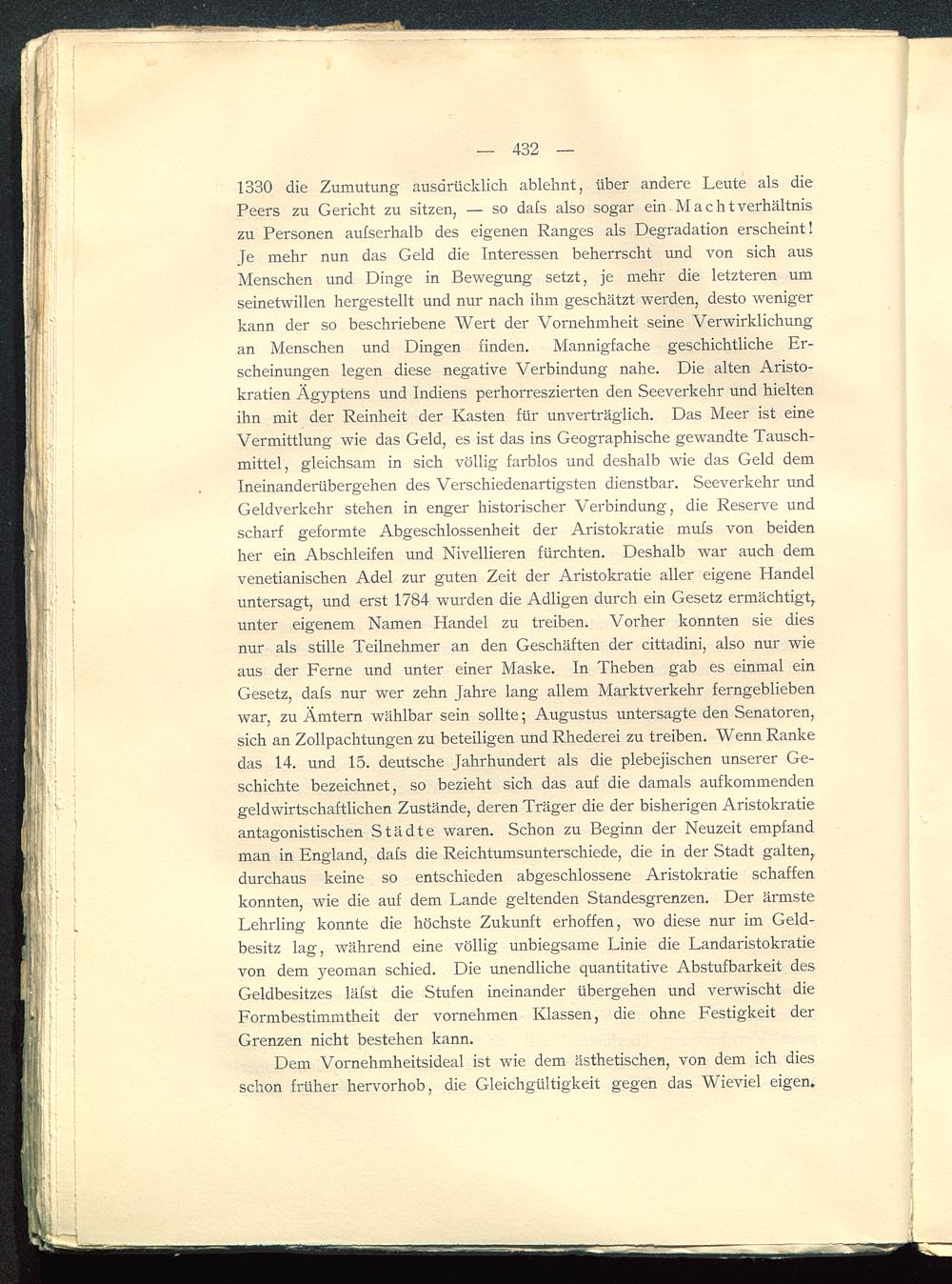 1330 die Zumutung ausdrücklich ablehnt, über andere Leute als diePeers zu Gericht zu sitzen, — so dafs also sogar ein M a c h t Verhältniszu Personen aufserhalb des eigenen Ranges als Degradation erscheint!Je mehr nun das Geld die Interessen beherrscht und von sich ausMenschen und Dinge in Bewegung setzt, je mehr die letzteren umseinetwillen hergestellt und nur nach ihm geschätzt werden, desto wenigerkann der so beschriebene Wert der Vornehmheit seine Verwirklichungan Menschen und Dingen finden. Mannigfache geschichtliche Er-scheinungen legen diese negative Verbindung nahe. Die alten Aristo-kratien Ägyptens und Indiens perhorreszierten den Seeverkehr und hieltenihn mit der Reinheit der Kasten für unverträglich. Das Meer ist eineVermittlung wie das Geld, es ist das ins Geographische gewandte Tausch-mittel, gleichsam in sich völlig farblos und deshalb wie das Geld demIneinanderübergehen des Verschiedenartigsten dienstbar. Seeverkehr undGeldverkehr stehen in enger historischer Verbindung, die Reserve undscharf geformte Abgeschlossenheit der Aristokratie mufs von beidenher ein Abschleifen und Nivellieren fürchten. Deshalb war auch demvenetianischen Adel zur guten Zeit der Aristokratie aller eigene Handeluntersagt, und erst 1784 wurden die Adligen durch ein Gesetz ermächtigt,unter eigenem Namen Handel zu treiben. Vorher konnten sie diesnur als stille Teilnehmer an den Geschäften der cittadini, also nur wieaus der Ferne und unter einer Maske. In Theben gab es einmal einGesetz, dafs nur wer zehn Jahre lang allem Marktverkehr ferngebliebenwar, zu Ämtern wählbar sein sollte; Augustus untersagte den Senatoren,sich an Zollpachtungen zu beteiligen und Rhederei zu treiben. Wenn Rankedas 14. und 15. deutsche Jahrhundert als die plebejischen unserer Ge-schichte bezeichnet, so bezieht sich das auf die damals aufkommendengeldwirtschaftlichen Zustände, deren Träger die der bisherigen Aristokratieantagonistischen Städte waren. Schon zu Beginn der Neuzeit empfandman in England, dafs die Reichtumsunterschiede, die in der Stadt galten,durchaus keine so entschieden abgeschlossene Aristokratie schaffenkonnten, wie die auf dem Lande geltenden Standesgrenzen. Der ärmsteLehrling konnte die höchste Zukunft erhoffen, wo diese nur im Geld-besitz lag, während eine völlig unbiegsame Linie die Landaristokratievon dem yeoman schied. Die unendliche quantitative Abstufbarkeit desGeldbesitzes läfst die Stufen ineinander übergehen und verwischt dieFormbestimmtheit der vornehmen Klassen, die ohne Festigkeit derGrenzen nicht bestehen kann.