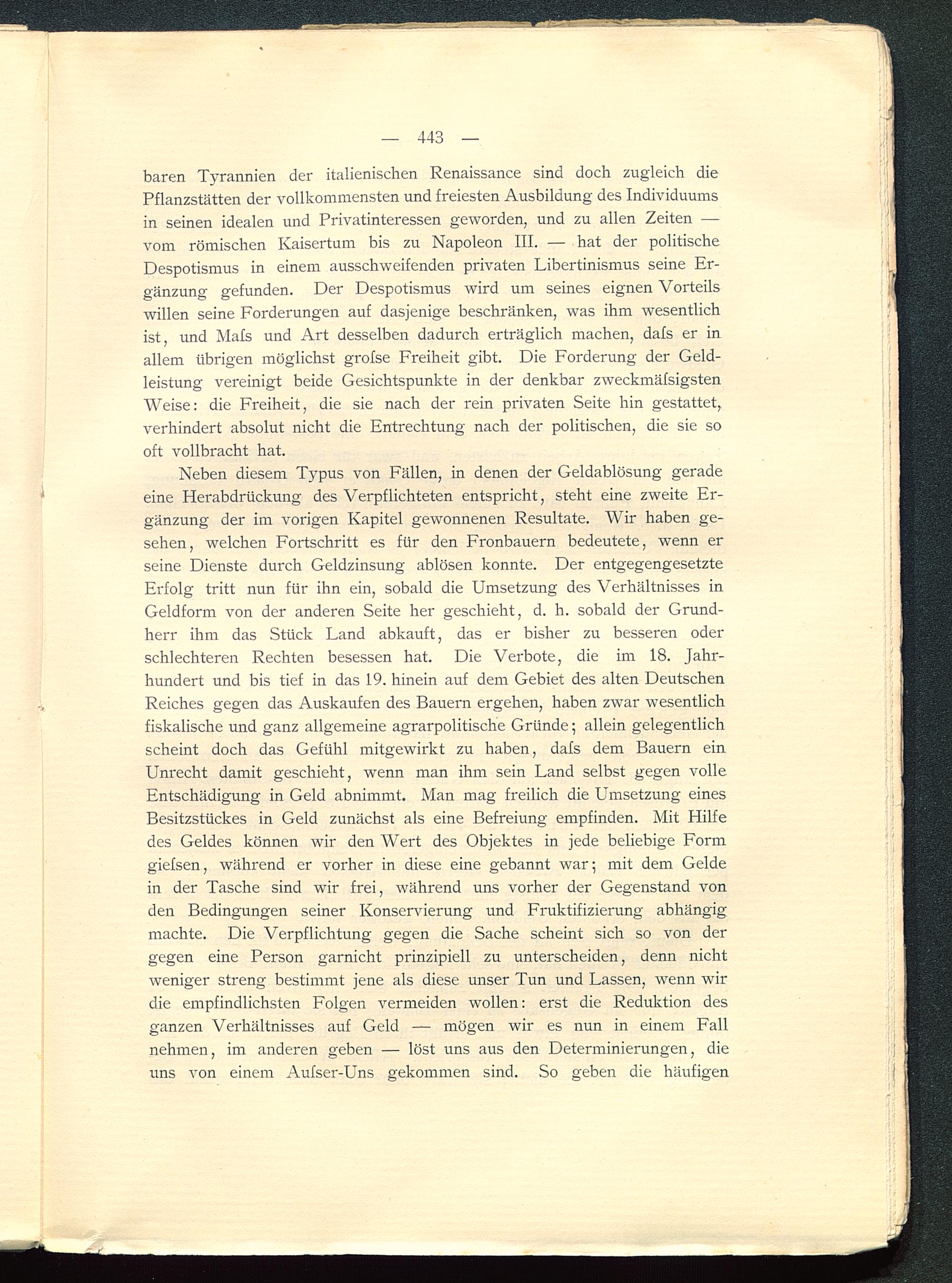 baren Tyrannien der italienischen Renaissance sind doch zugleich diePflanzstätten der vollkommensten und freiesten Ausbildung des Individuumsin seinen idealen und Privatinteressen geworden, und zu allen Zeiten —vom römischen Kaisertum bis zu Napoleon III. — hat der politischeDespotismus in einem ausschweifenden privaten Libertinismus seine Er-gänzung gefunden. Der Despotismus wird um seines eignen Vorteilswillen seine Forderungen auf dasjenige beschränken, was ihm wesentlichist, und Mafs und Art desselben dadurch erträglich machen, dafs er inallem übrigen möglichst grofse Freiheit gibt. Die Forderung der Geld-leistung vereinigt beide Gesichtspunkte in der denkbar zweckmäfsigstenWeise: die Freiheit, die sie nach der rein privaten Seite hin gestattet,verhindert absolut nicht die Entrechtung nach der politischen, die sie sooft vollbracht hat.