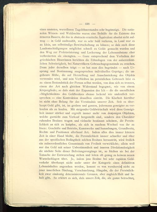 eines unsteten, wurzellosen Tagelöhnerstandes sehr begünstigt. Die natio-nalen Wiesen- und Waldrechte waren eine Beihilfe für die Existenz desärmeren Bauern, die das in abstracto ermittelte Äquivalent absolut nicht auf-wog — in Geld ausbezahlt, war es sehr bald verloren, in Land war eszu klein, um selbständige Bewirtschaftung zu lohnen; so dafs auch dieseLandentschädigungen möglichst schnell zu Gelde gemacht wurden undden Weg zur Proletarisierung und Lockerung der Lebenssubstanz eherverbreiterten als einengten. — Ganz entsprechend dem Verhalten dergriechischen Bäuerinnen berichten die Ethnologen von der aufserordent-lichen Schwierigkeit, bei Naturvölkern Gebrauchsgegenstände zu erstehen.Denn jeder derselben trägt — so hat man dies begründet — nach Ur-sprung und Bestimmung ausgesprochen individuelles Gepräge; die un-geheure Mühe, die auf Herstellung und Ausschmückung des Objektsverwendet wird, und sein Verbleiben im persönlichen Gebrauch läfst eszu einem Bestandstück der Person selbst werden, von dem sich zu trennen,einem der Art nach gleichen Widerstand begegnet, wie von einem.Körpergliede; so dafs statt der Expansion des Ich— die die unendlichen»Möglichkeiten« des Geldbesitzes ebenso lockend wie undeutlich ver-sprechen — eine Kontraktion desselben eintritt. Die Klarheit hierüberist nicht ohne Belang für das Verständnis unserer Zeit. Seit es über-haupt Geld gibt, ist, im grofsen und ganzen, jedermann geneigter zu ver-kaufen als zu kaufen. Mit steigender Geldwirtschaft wird diese Geneigt-heit immer stärker und ergreift immer mehr von denjenigen Objekten,welche garnicht zum Verkauf hergestellt sind, sondern den Charakterruhenden Besitzes tragen und vielmehr bestimmt scheinen, die Persön-lichkeit an sich zu knüpfen, als sich in raschem Wechsel von ihr zulösen: Geschäfte und Betriebe, Kunstwerke und Sammlungen, Grundbesitz,Rechte und Positionen allerhand Art. Indem alles dies immer kürzereZeit in einer Hand bleibt, die Persönlichkeit immer schneller und öfteraus der spezifischen Bedingtheit solchen Besitzes heraustritt, wird freilichein aufserordentliches Gesamtmafs von Freiheit verwirklicht; allein weilnur das Geld mit seiner Unbestimmtheit und inneren Direktionslosigkeitdie nächste Seite dieser Befreiungsvorgänge ist, so bleiben sie bei derTatsache der Entwurzelung stehen und leiten oft genug zu keinem neuenWurzelschlagen über. Ja, indem jene Besitze bei sehr rapidem Geld-verkehr überhaupt nicht mehr unter der Kategorie eines definitivenLebensinhaltes angesehen werden, kommt es von vornherein] nicht zujener innerlichen Bindung, Verschmelzung, Hingabe, die der Persönlich-keit zwar eindeutig determinierende Grenzen, aber zugleich Halt und In-halt gibt. So erklärt es sich, dafs unsere Zeit, die, als ganze betrachtet,