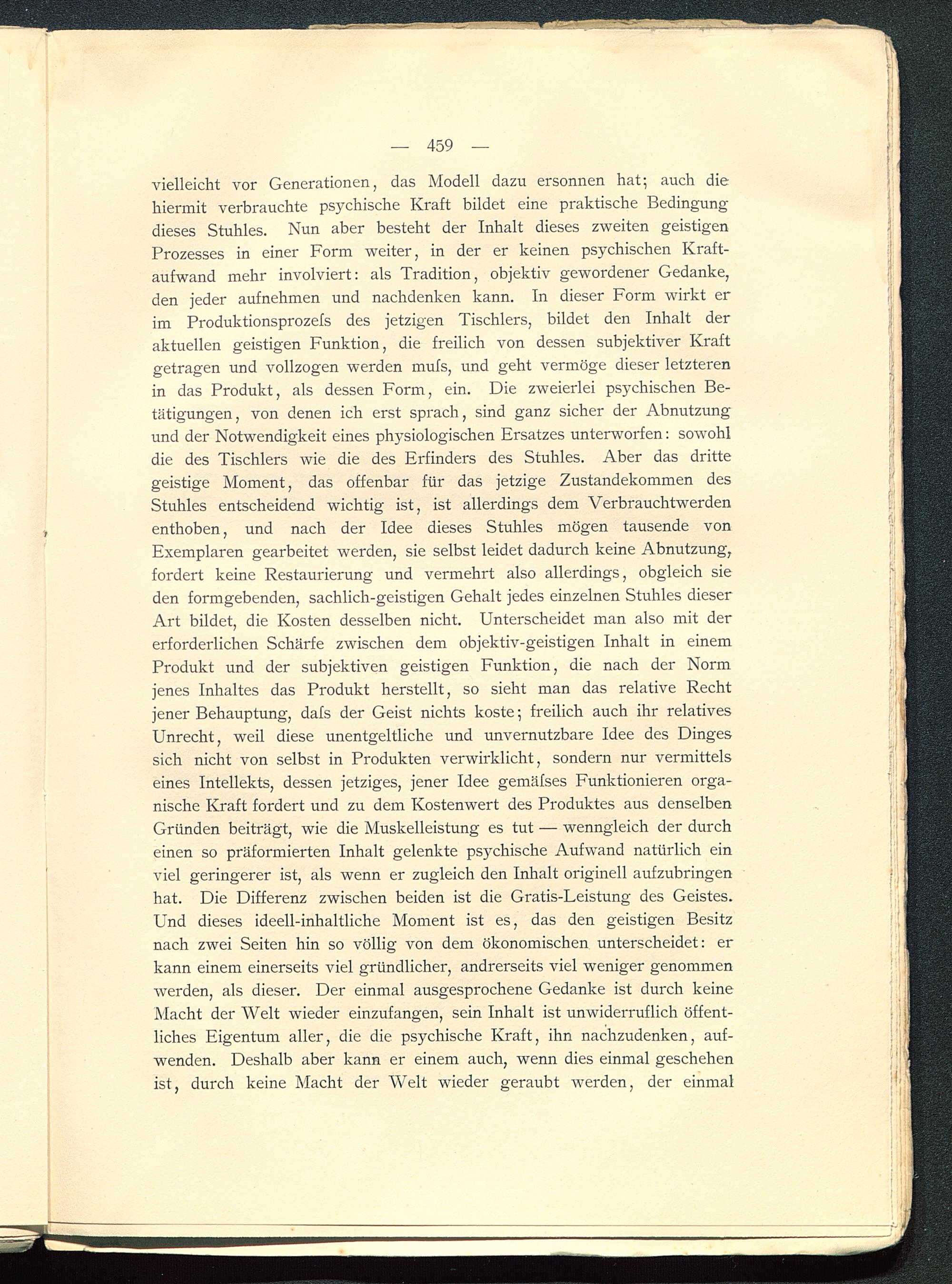 vielleicht vor Generationen, das Modell dazu ersonnen hat; auch diehiermit verbrauchte psychische Kraft bildet eine praktische Bedingungdieses Stuhles. Nun aber besteht der Inhalt dieses zweiten geistigenProzesses in einer Form weiter, in der er keinen psychischen Kraft-aufwand mehr involviert: als Tradition, objektiv gewordener Gedanke,den jeder aufnehmen und nachdenken kann. In dieser Form wirkt erim Produktionsprozefs des jetzigen Tischlers, bildet den Inhalt deraktuellen geistigen Funktion, die freilich von dessen subjektiver Kraftgetragen und vollzogen werden mufs, und geht vermöge dieser letzterenin das Produkt, als dessen Form, ein. Die zweierlei psychischen Be-tätigungen, von denen ich erst sprach, sind ganz sicher der Abnutzungund der Notwendigkeit eines physiologischen Ersatzes unterworfen: sowohldie des Tischlers wie die des Erfinders des Stuhles. Aber das drittegeistige Moment, das offenbar für das jetzige Zustandekommen desStuhles entscheidend wichtig ist, ist allerdings dem Verbrauchtwerdenenthoben, und nach der Idee dieses Stuhles mögen tausende vonExemplaren gearbeitet werden, sie selbst leidet dadurch keine Abnutzung,fordert keine Restaurierung und vermehrt also allerdings, obgleich sieden formgebenden, sachlich-geistigen Gehalt jedes einzelnen Stuhles dieserArt bildet, die Kosten desselben nicht. Unterscheidet man also mit dererforderlichen Schärfe zwischen dem objektiv-geistigen Inhalt in einemProdukt und der subjektiven geistigen Funktion, die nach der Normjenes Inhaltes das Produkt herstellt, so sieht man das relative Rechtjener Behauptung, dafs der Geist nichts koste; freilich auch ihr relativesUnrecht, weil diese unentgeltliche und unvernutzbare Idee des Dingessich nicht von selbst in Produkten verwirklicht, sondern nur vermittelseines Intellekts, dessen jetziges, jener Idee gemäfses Funktionieren orga-nische Kraft fordert und zu dem Kostenwert des Produktes aus denselbenGründen beiträgt, wie die Muskelleistung es tut — wenngleich der durcheinen so präformierten Inhalt gelenkte psychische Aufwand natürlich einviel geringerer ist, als wenn er zugleich den Inhalt originell aufzubringenhat. Die Differenz zwischen beiden ist die Gratis-Leistung des Geistes.Und dieses ideell-inhaltliche Moment ist es, das den geistigen Besitznach zwei Seiten hin so völlig von dem ökonomischen unterscheidet: erkann einem einerseits viel gründlicher, andrerseits viel weniger genommenwerden, als dieser. Der einmal ausgesprochene Gedanke ist durch keineMacht der Welt wieder einzufangen, sein Inhalt ist unwiderruflich öffent-liches Eigentum aller, die die psychische Kraft, ihn nachzudenken, auf-wenden. Deshalb aber kann er einem auch, wenn dies einmal geschehenist, durch keine Macht der Welt wieder geraubt werden, der einmal