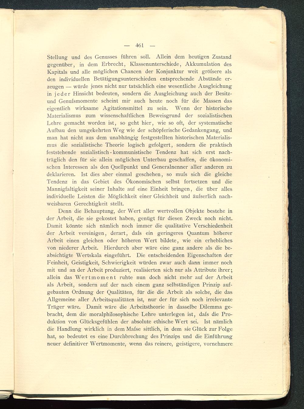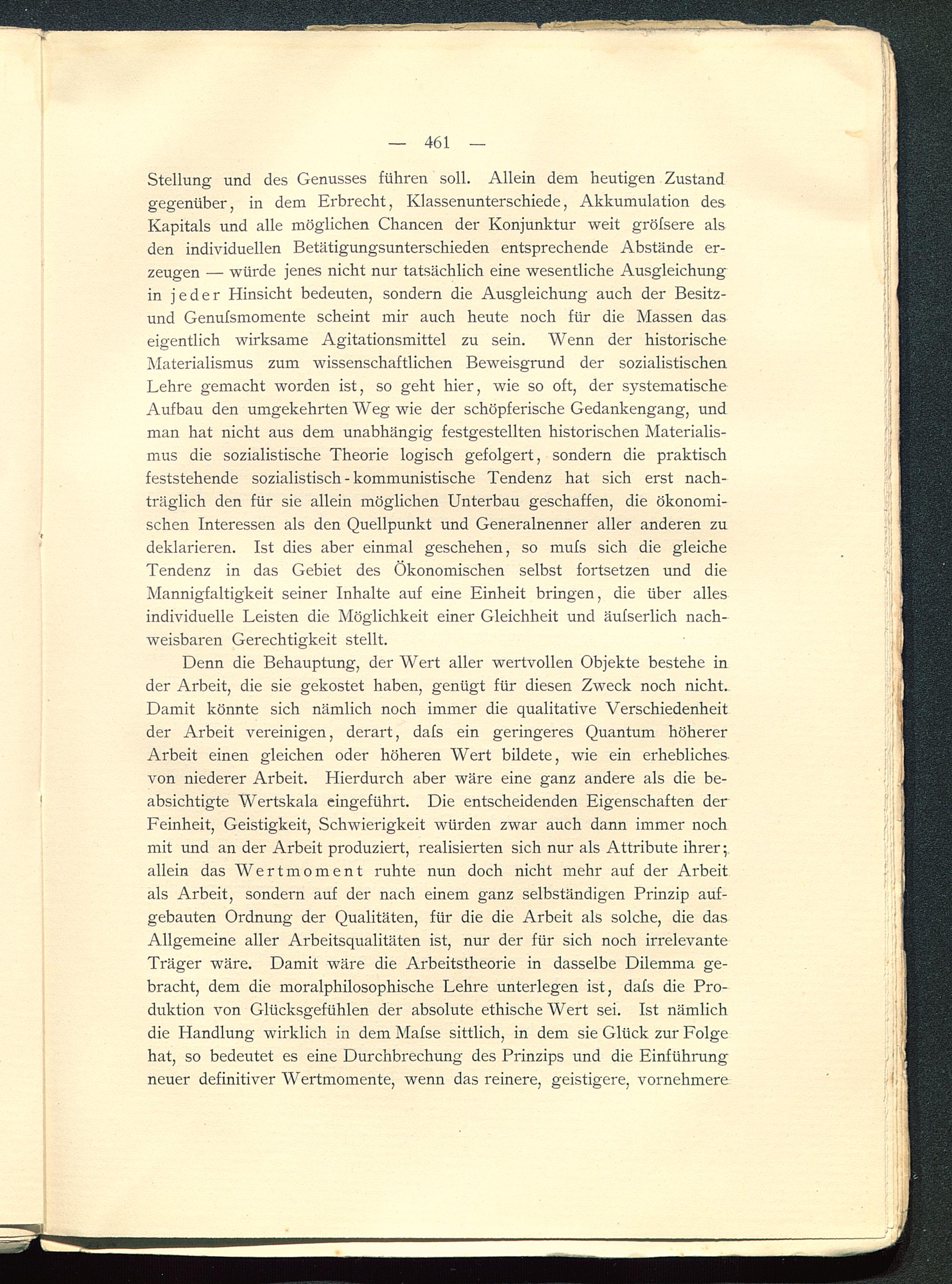 Denn die Behauptung, der Wert aller wertvollen Objekte bestehe inder Arbeit, die sie gekostet haben, genügt für diesen Zweck noch nicht.Damit könnte sich nämlich noch immer die qualitative Verschiedenheitder Arbeit vereinigen, derart, dafs ein geringeres Quantum höhererArbeit einen gleichen oder höheren Wert bildete, wie ein erhebliches-von niederer Arbeit. Hierdurch aber wäre eine ganz andere als die be-absichtigte Wertskala eingeführt. Die entscheidenden Eigenschaften derFeinheit, Geistigkeit, Schwierigkeit würden zwar auch dann immer nochmit und an der Arbeit produziert, realisierten sich nur als Attribute ihrer;allein das Wertmoment ruhte nun doch nicht mehr auf der Arbeitals Arbeit, sondern auf der nach einem ganz selbständigen Prinzip auf-gebauten Ordnung der Qualitäten, für die die Arbeit als solche, die dasAllgemeine aller Arbeitsqualitäten ist, nur der für sich noch irrelevanteTräger wäre. Damit wäre die Arbeitstheorie in dasselbe Dilemma ge-bracht, dem die moralphilosophische Lehre unterlegen ist, dafs die Pro-duktion von Glücksgefühlen der absolute ethische Wert sei. Ist nämlichdie Handlung wirklich in dem Malse sittlich, in dem sie Glück zur Folgehat, so bedeutet es eine Durchbrechung des Prinzips und die Einführungneuer definitiver Wertmomente, wenn das reinere, geistigere, vornehmere