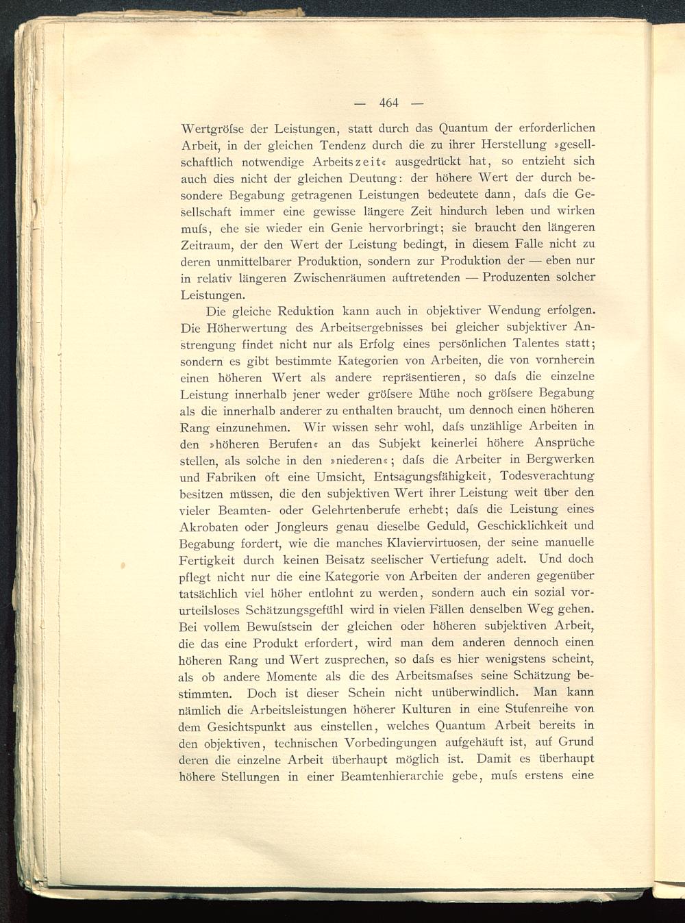 Die gleiche Reduktion kann auch in objektiver Wendung erfolgen.Die Höherwertung des Arbeitsergebnisses bei gleicher subjektiver An-strengung findet nicht nur als Erfolg eines persönlichen Talentes statt;sondern es gibt bestimmte Kategorien von Arbeiten, die von vornhereineinen höheren Wert als andere repräsentieren, so dafs die einzelneLeistung innerhalb jener weder gröfsere Mühe noch gröfsere Begabungals die innerhalb anderer zu enthalten braucht, um dennoch einen höherenRang einzunehmen. Wir wissen sehr wohl, dafs unzählige Arbeiten inden »höheren Berufen« an das Subjekt keinerlei höhere Ansprüchestellen, als solche in den »niederen«; dafs die Arbeiter in Bergwerkenund Fabriken oft eine Umsicht, Entsagungsfähigkeit, Todesverachtungbesitzen müssen, die den subjektiven Wert ihrer Leistung weit über denvieler Beamten- oder Gelehrtenberufe erhebt; dafs die Leistung einesAkrobaten oder Jongleurs genau dieselbe Geduld, Geschicklichkeit undBegabung fordert, wie die manches Klaviervirtuosen, der seine manuelleFertigkeit durch keinen Beisatz seelischer Vertiefung adelt. Und dochpflegt nicht nur die eine Kategorie von Arbeiten der anderen gegenübertatsächlich viel höher entlohnt zu werden, sondern auch ein sozial vor-urteilsloses Schätzungsgefühl w r ird in vielen Fällen denselben Weg gehen.Bei vollem Bewufstsein der gleichen oder höheren subjektiven Arbeit,die das eine Produkt erfordert, wird man dem anderen dennoch einenhöheren Rang und Wert zusprechen, so dafs es hier wenigstens scheint,als ob andere Momente als die des Arbeitsmafses seine Schätzung be-stimmten. Doch ist dieser Schein nicht unüberwindlich. Man kannnämlich die Arbeitsleistungen höherer Kulturen in eine Stufenreihe vondem Gesichtspunkt aus einstellen, welches Quantum Arbeit bereits inden objektiven, technischen Vorbedingungen aufgehäuft ist, auf Grundderen die einzelne Arbeit überhaupt möglich ist. Damit es überhaupthöhere Stellungen in einer Beamtenhierarchie gebe, mufs erstens eine