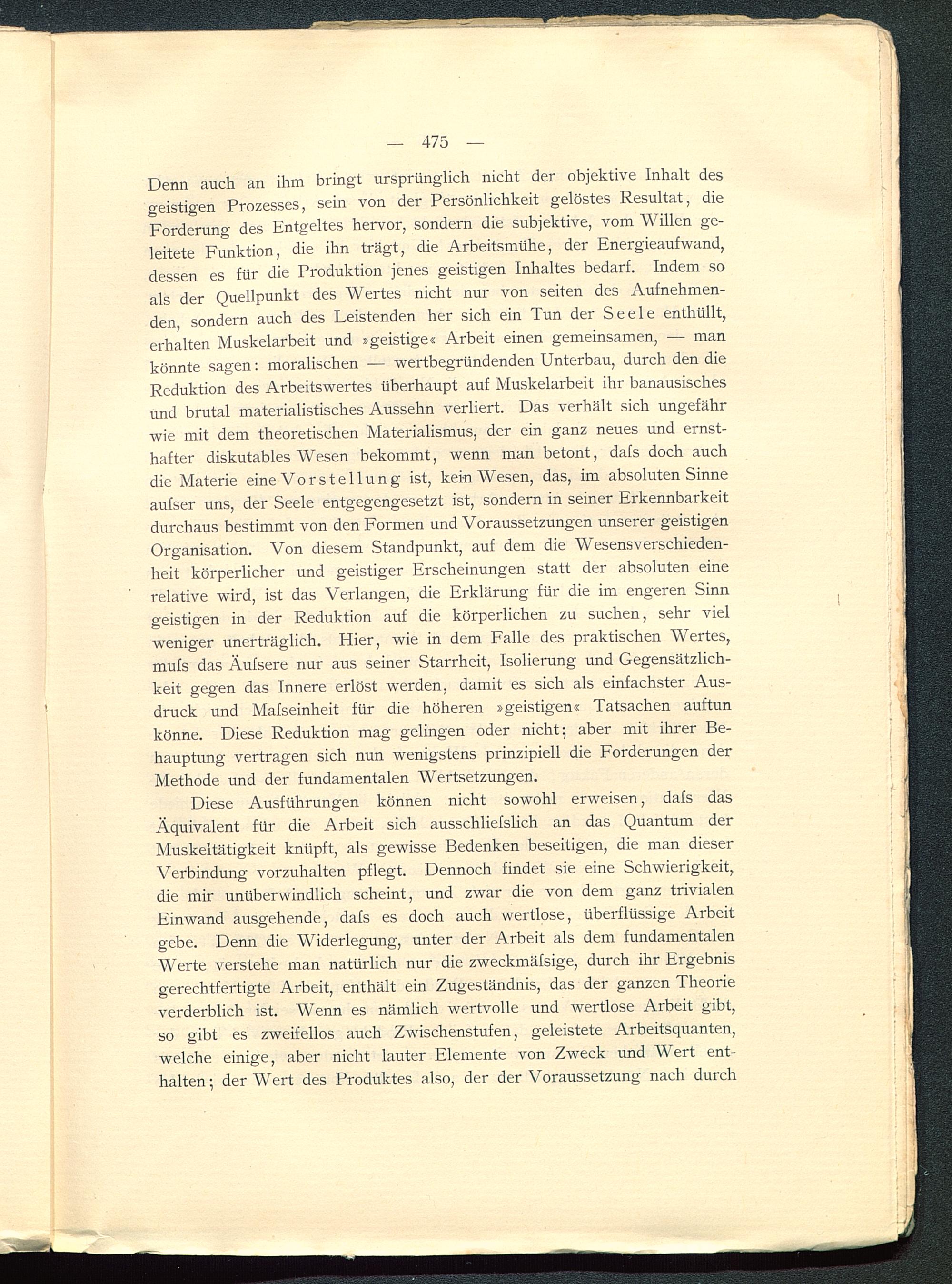 Diese Ausführungen können nicht sowohl erweisen, dafs dasÄquivalent für die Arbeit sich ausschliefslich an das Quantum derMuskeltätigkeit knüpft, als gewisse Bedenken beseitigen, die man dieserVerbindung vorzuhalten pflegt. Dennoch findet sie eine Schwierigkeit,die mir unüberwindlich scheint, und zwar die von dem ganz trivialenEinwand ausgehende, dafs es doch auch wertlose, überflüssige Arbeitgebe. Denn die Widerlegung, unter der Arbeit als dem fundamentalenWerte verstehe man natürlich nur die zweckmäfsige, durch ihr Ergebnisgerechtfertigte Arbeit, enthält ein Zugeständnis, das der ganzen Theorieverderblich ist. W T enn es nämlich wertvolle und wertlose Arbeit gibt,so gibt es zweifellos auch Zwischenstufen, geleistete Arbeitsquanten,welche einige, aber nicht lauter Elemente von Zweck und Wert ent-halten; der Wert des Produktes also, der der Voraussetzung nach durch