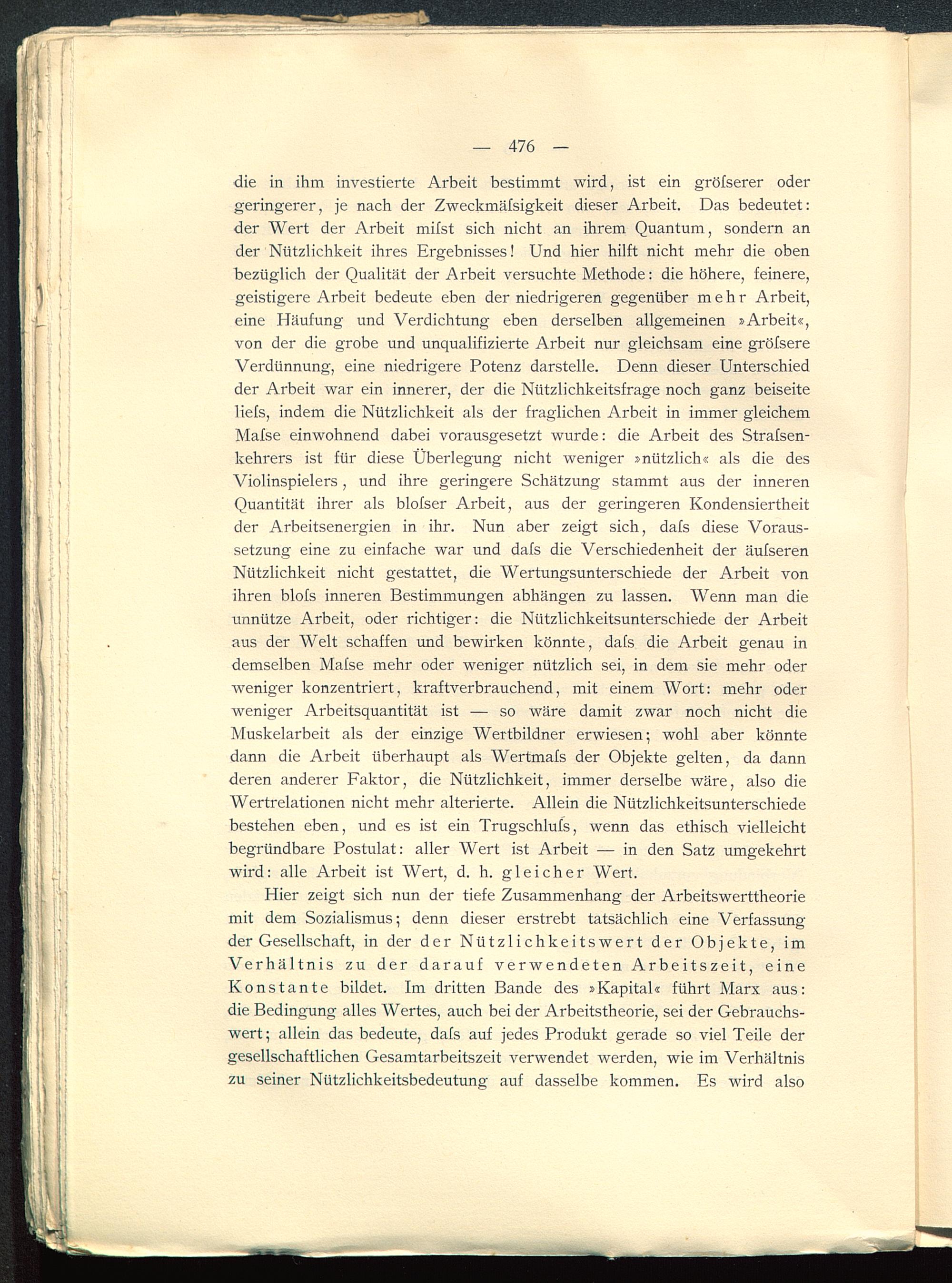 Hier zeigt sich nun der tiefe Zusammenhang der Arbeitswerttheoriemit dem Sozialismus; denn dieser erstrebt tatsächlich eine Verfassungder Gesellschaft, in der der Nützlichkeitswert der Objekte, imVerhältnis zu der darauf verwendeten Arbeitszeit, eineKonstante bildet. Im dritten Bande des »Kapital« führt Marx aus:die Bedingung alles Wertes, auch bei der Arbeitstheorie, sei der Gebrauchs-wert; allein das bedeute, dafs auf jedes Produkt gerade so viel Teile dergesellschaftlichen Gesamtarbeitszeit verwendet werden, wie im Verhältniszu seiner Nützlichkeitsbedeutung auf dasselbe kommen. Es wird also