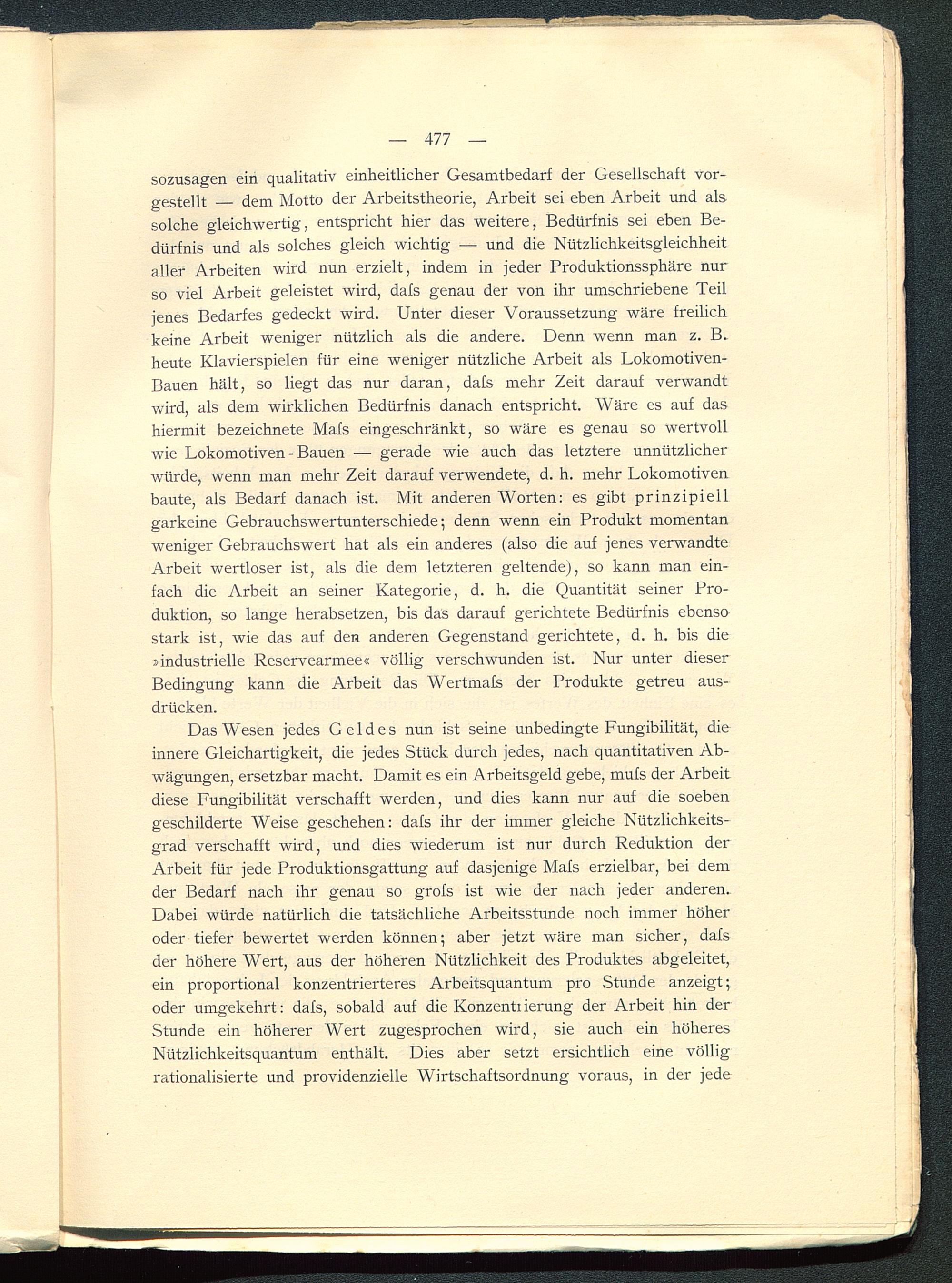 Das Wesen jedes Geldes nun ist seine unbedingte Fungibilität, dieinnere Gleichartigkeit, die jedes Stück durch jedes, nach quantitativen Ab-wägungen, ersetzbar macht. Damit es ein Arbeitsgeld gebe, mufs der Arbeitdiese Fungibilität verschafft werden, und dies kann nur auf die soebengeschilderte Weise geschehen: dafs ihr der immer gleiche Nützlichkeits-grad verschafft wird, und dies wiederum ist nur durch Reduktion derArbeit für jede Produktionsgattung auf dasjenige Mafs erzielbar, bei demder Bedarf nach ihr genau so grofs ist wie der nach jeder anderen.Dabei würde natürlich die tatsächliche Arbeitsstunde noch immer höheroder tiefer bewertet werden können; aber jetzt wäre man sicher, dafsder höhere Wert, aus der höheren Nützlichkeit des Produktes abgeleitet,ein proportional konzentrierteres Arbeitsquantum pro Stunde anzeigt;oder umgekehrt: dafs, sobald auf die Konzenti ierung der Arbeit hin derStunde ein höherer Wert zugesprochen wird, sie auch ein höheresNützlichkeitsquantum enthält. Dies aber setzt ersichtlich eine völligrationalisierte und providenzielle Wirtschaftsordnung voraus, in der jede