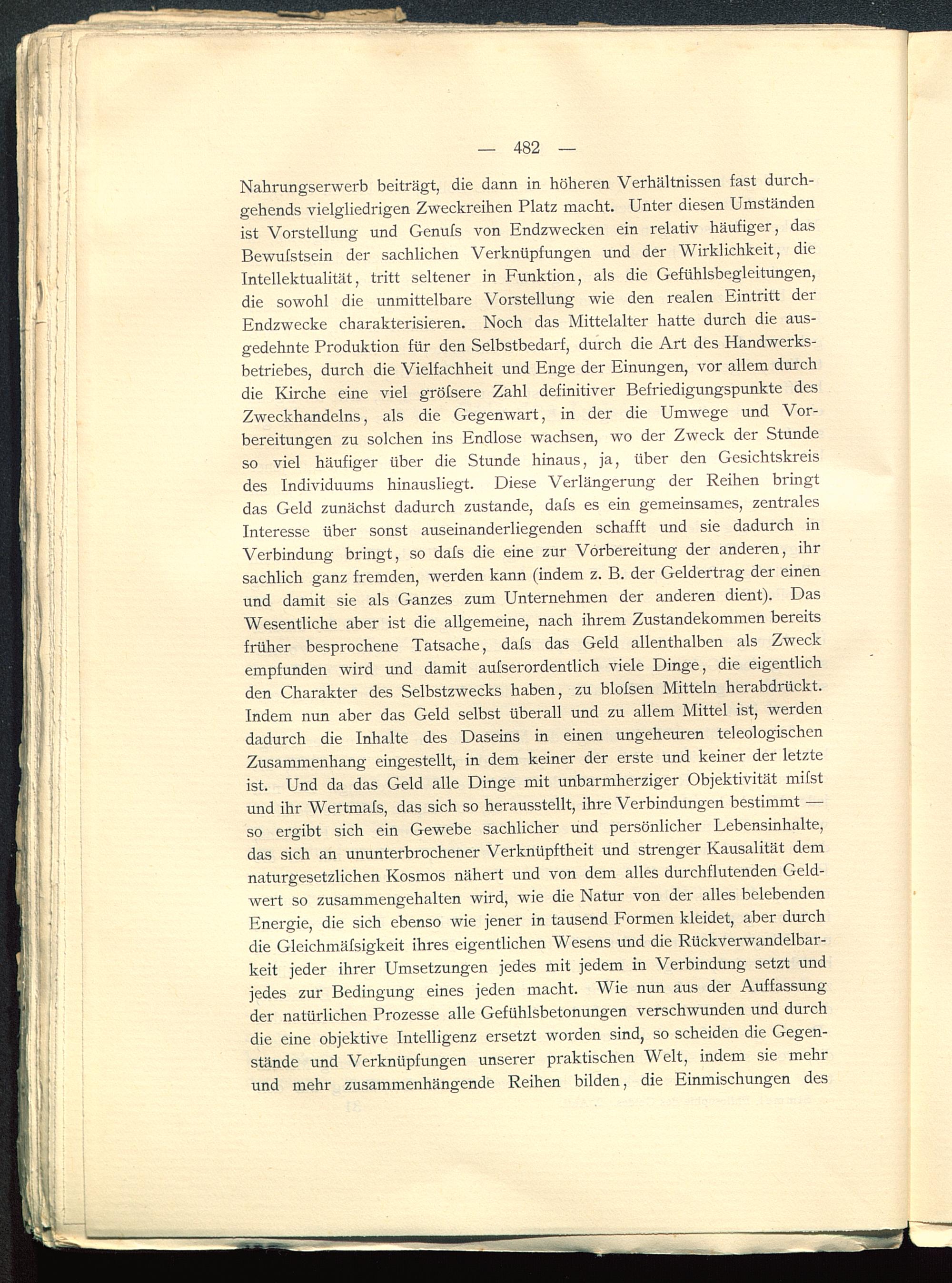 Nahrungserwerb beiträgt, die dann in höheren Verhältnissen fast durch-gehends vielgliedrigen Zweckreihen Platz macht. Unter diesen Umständenist Vorstellung und Genufs von Endzwecken ein relativ häufiger, dasBewufstsein der sachlichen Verknüpfungen und der Wirklichkeit, dieIntellektualität, tritt seltener in Funktion, als die Gefühlsbegleitungen,die sowohl die unmittelbare Vorstellung wie den realen Eintritt derEndzwecke charakterisieren. Noch das Mittelalter hatte durch die aus-gedehnte Produktion für den Selbstbedarf, durch die Art des Handwerks-betriebes, durch die Vielfachheit und Enge der Einungen, vor allem durchdie Kirche eine viel gröfsere Zahl definitiver Befriedigungspunkte desZweckhandelns, als die Gegenwart, in der die Umwege und Vor-bereitungen zu solchen ins Endlose wachsen, wo der Zweck der Stundeso viel häufiger über die Stunde hinaus, ja, über den Gesichtskreisdes Individuums hinausliegt. Diese Verlängerung der Reihen bringtdas Geld zunächst dadurch zustande, dafs es ein gemeinsames, zentralesInteresse über sonst auseinanderliegenden schafft und sie dadurch inVerbindung bringt, so dafs die eine zur Vorbereitung der anderen, ihrsachlich ganz fremden, werden kann (indem z. B. der Geldertrag der einenund damit sie als Ganzes zum Unternehmen der anderen dient). DasWesentliche aber ist die allgemeine, nach ihrem Zustandekommen bereitsfrüher besprochene Tatsache, dafs das Geld allenthalben als Zweckempfunden wird und damit aufserordentlich viele Dinge, die eigentlichden Charakter des Selbstzwecks haben, zu blofsen Mitteln herabdrückt.Indem nun aber das Geld selbst überall und zu allem Mittel ist, werdendadurch die Inhalte des Daseins in einen ungeheuren teleologischenZusammenhang eingestellt, in dem keiner der erste und keiner der letzteist. Und da das Geld alle Dinge mit unbarmherziger Objektivität mifstund ihr Wertmafs, das sich so herausstellt, ihre Verbindungen bestimmt —so ergibt sich ein Gewebe sachlicher und persönlicher Lebensinhalte,das sich an ununterbrochener Verknüpftheit und strenger Kausalität demnaturgesetzlichen Kosmos nähert und von dem alles durchflutenden Geld-wert so zusammengehalten wird, wie die Natur von der alles belebendenEnergie, die sich ebenso wie jener in tausend Formen kleidet, aber durchdie Gleichmäfsigkeit ihres eigentlichen Wesens und die Rückverwandelbar-keit jeder ihrer Umsetzungen jedes mit jedem in Verbindung setzt undjedes zur Bedingung eines jeden macht. Wie nun aus der Auffassungder natürlichen Prozesse alle Gefühlsbetonungen verschwunden und durchdie eine objektive Intelligenz ersetzt worden sind, so scheiden die Gegen-stände und Verknüpfungen unserer praktischen Welt, indem sie mehrund mehr zusammenhängende Reihen bilden, die Einmischungen des
