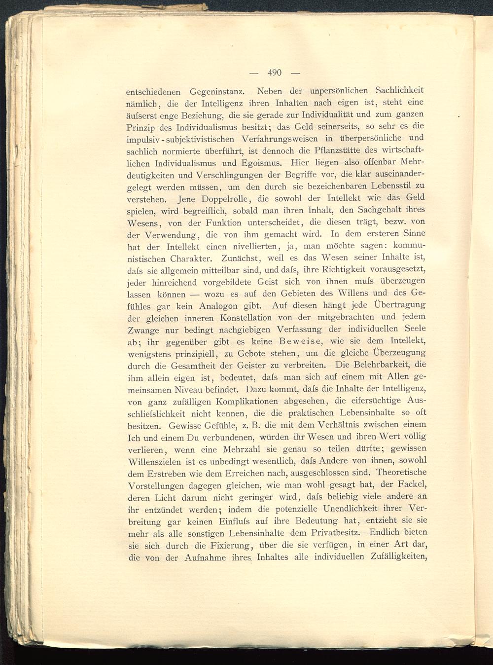 entschiedenen Gegeninstanz. Neben der unpersönlichen Sachlichkeitnämlich, die der Intelligenz ihren Inhalten nach eigen ist, steht eineäulserst enge Beziehung, die sie gerade zur Individualität und zum ganzenPrinzip des Individualismus besitzt; das Geld seinerseits, so sehr es dieimpulsiv - subjektivistischen Verfahrungsweisen in überpersönliche undsachlich normierte überführt, ist dennoch die Pflanzstätte des wirtschaft-lichen Individualismus und Egoismus. Hier liegen also offenbar Mehr-deutigkeiten und Verschlingungen der Begriffe vor, die klar auseinander-gelegt werden müssen, um den durch sie bezeichenbaren Lebensstil zuverstehen. Jene Doppelrolle, die sowohl der Intellekt wie das Geldspielen, wird begreiflich, sobald man ihren Inhalt, den Sachgehalt ihresWesens, von der Funktion unterscheidet, die diesen trägt, bezw. vonder Verwendung, die von ihm gemacht wird. In dem ersteren Sinnehat der Intellekt einen nivellierten, ja, man möchte sagen: kommu-nistischen Charakter. Zunächst, weil es das Wesen seiner Inhalte ist,dafs sie allgemein mitteilbar sind, und dafs, ihre Richtigkeit vorausgesetzt,jeder hinreichend vorgebildete Geist sich von ihnen mufs überzeugenlassen können — wozu es auf den Gebieten des Willens und des Ge-fühles gar kein Analogon gibt. Auf diesen hängt jede Übertragungder gleichen inneren Konstellation von der mitgebrachten und jedemZwange nur bedingt nachgiebigen Verfassung der individuellen Seeleab; ihr gegenüber gibt es keine Beweise, wie sie dem Intellekt,wenigstens prinzipiell, zu Gebote stehen, um die gleiche Überzeugungdurch die Gesamtheit der Geister zu verbreiten. Die Beiehrbarkeit, dieihm allein eigen ist, bedeutet, dafs man sich auf einem mit Allen ge-meinsamen Niveau befindet. Dazu kommt, dafs die Inhalte der Intelligenz,von ganz zufälligen Komplikationen abgesehen, die eifersüchtige Aus-schliefsliclikeit nicht kennen, die die praktischen Lebensinhalte so oftbesitzen. Gewisse Gefühle, z. B. die mit dem Verhältnis zwischen einemIch und einem Du verbundenen, würden ihr Wesen und ihren Wert völligverlieren, wenn eine Mehrzahl sie genau so teilen dürfte; gewissenWillenszielen ist es unbedingt wesentlich, dafs Andere von ihnen, sowohldem Erstreben wie dem Erreichen nach, ausgeschlossen sind. TheoretischeVorstellungen dagegen gleichen, wie man wohl gesagt hat, der Fackel,deren Licht darum nicht geringer wird, dafs beliebig viele andere anihr entzündet werden; indem die potenzielle Unendlichkeit ihrer Ver-breitung gar keinen Einflufs auf ihre Bedeutung hat, entzieht sie siemehr als alle sonstigen Lebensinhalte dem Privatbesitz. Endlich bietensie sich durch die Fixierung, über die sie verfügen, in einer Art dar,die von der Aufnahme ihres Inhaltes alle individuellen Zufälligkeiten,