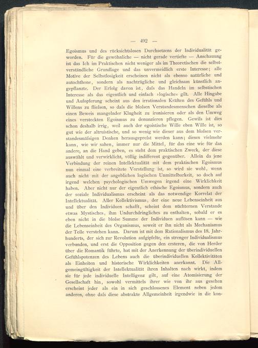 Egoismus und des rücksichtslosen Durchsetzens der Individualität ge-worden. Für die gewöhnliche — nicht gerade vertiefte — Anschauungist das Ich im Praktischen nicht weniger als im Theoretischen die selbst-verständliche Grundlage und das unvermeidlich erste Interesse; alleMotive der Selbstlosigkeit erscheinen nicht als ebenso natürliche undautochthone, sondern als nachträgliche und gleichsam künstlich an-gepflanzte. Der Erfolg davon ist, dafs das Handeln im selbstischenInteresse als das eigentlich und einfach » logische« gilt. Alle Hingabeund Aufopferung scheint aus den irrationalen Kräften des Gefühls undWillens zu fliefsen, so dafs die blofsen Verstandesmenschen dieselbe alseinen Beweis mangelnder Klugheit zu ironisieren oder als den Umwegeines versteckten Egoismus zu denunzieren pflegen. Gewifs ist diesschon deshalb irrig, weil auch der egoistische Wille eben Wille ist, sogut wie der altruistische, und so wenig wie dieser aus dem blofsen ver-standesmäfsigen Denken herausgeprefst werden kann; dieses vielmehrkann, wie wir sahen, immer nur die Mittel, für das eine wie für dasandere, an die Hand geben, es steht dem praktischen Zweck, der dieseauswählt und verwirklicht, völlig indifferent gegenüber. Allein da jeneVerbindung der reinen Intellektualität mit dem praktischen Egoismusnun einmal eine verbreitete Vorstellung ist, so wird sie wohl, wennauch nicht mit der angeblichen logischen Unmittelbarkeit, so doch aufirgend welchen psychologischen Umwegen irgend eine Wirklichkeithaben. Aber nicht nur der eigentlich ethische Egoismus, sondern auchder soziale Individualismus erscheint als das notwendige Korrelat derIntellektualität. Aller Kollektivismus, der eine neue Lebenseinheit ausund über den Individuen schafft, scheint dem nüchternen Verständeetwas Mystisches, ihm Undurchdringliches zu enthalten, sobald er eseben nicht in die blofse Summe der Individuen auflösen kann — wiedie Lebenseinheit des Organismus, soweit er ihn nicht als Mechanismusder Teile verstehen kann. Darum ist mit dem Rationalismus des 18. Jahr-hunderts, der sich zur Revolution aufgipfelte, ein strenger Individualismusverbunden, und erst die Opposition gegen den ersteren, die von Herderüber die Romantik führte, hat mit der Anerkennung der überindividuellenGefühlspotenzen des Lebens auch die überindividuellen Kollektivitätenals Einheiten und historische Wirklichkeiten anerkannt. Die All-gemeingültigkeit der Intellektualität ihren Inhalten nach wirkt, indemsie für jede individuelle Intelligenz gilt, auf eine Atomisierung derGesellschaft hin, sowohl vermittels ihrer wie von ihr aus gesehenerscheint jeder als ein in sich geschlossenes Element neben jedemanderen, ohne dafs diese abstrakte Allgemeinheit irgendwie in die kon-