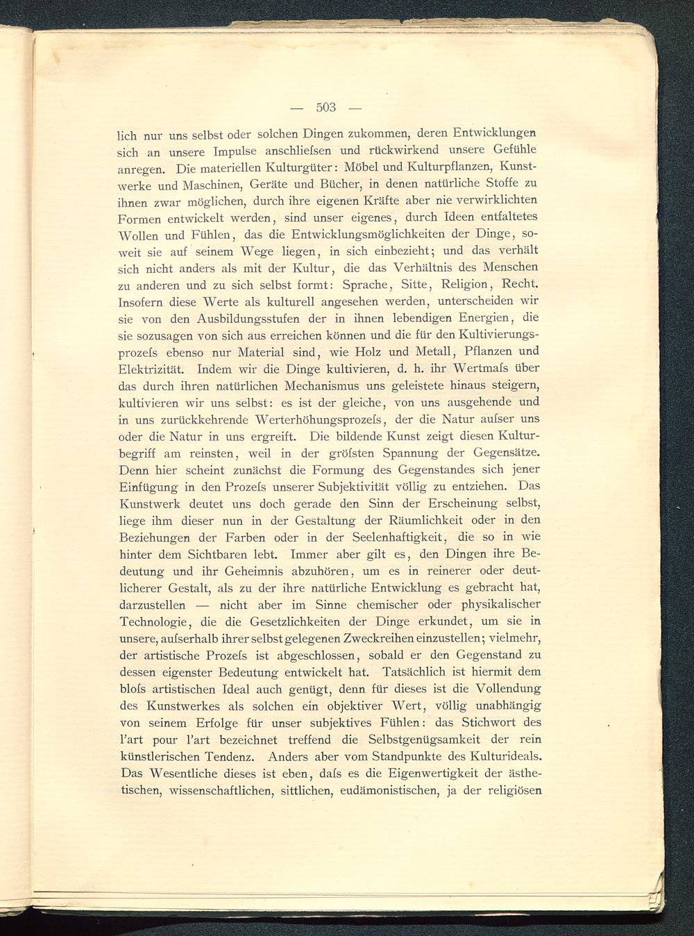 lieh nur uns selbst oder solchen Dingen zukommen, deren Entwicklungensich an unsere Impulse anschlielsen und rückwirkend unsere Gefühleanregen. Die materiellen Kulturgüter: Möbel und Kulturpflanzen, Kunst-werke und Maschinen, Geräte und Bücher, in denen natürliche Stoffe zuihnen zwar möglichen, durch ihre eigenen Kräfte aber nie verwirklichtenFormen entwickelt werden, sind unser eigenes, durch Ideen entfaltetesWollen und Fühlen, das die Entwicklungsmöglichkeiten der Dinge, so-weit sie auf seinem Wege liegen, in sich einbezieht; und das verhältsich nicht anders als mit der Kultur, die das Verhältnis des Menschenzu anderen und zu sich selbst formt: Sprache, Sitte, Religion, Recht.Insofern diese Werte als kulturell angesehen werden, unterscheiden wirsie von den Ausbildungsstufen der in ihnen lebendigen Energien, diesie sozusagen von sich aus erreichen können und die für den Kultivierungs-prozefs ebenso nur Material sind, wie Holz und Metall, Pflanzen undElektrizität. Indem wir die Dinge kultivieren, d. h. ihr Wertmafs überdas durch ihren natürlichen Mechanismus uns geleistete hinaus steigern,kultivieren wir uns selbst: es ist der gleiche, von uns ausgehende undin uns zurückkehrende Werterhöhungsprozefs, der die Natur aufser unsoder die Natur in uns ergreift. Die bildende Kunst zeigt diesen Kultur-begriff am reinsten, weil in der gröfsten Spannung der Gegensätze.Denn hier scheint zunächst die Formung des Gegenstandes sich jenerEinfügung in den Prozefs unserer Subjektivität völlig zu entziehen. DasKunstwerk deutet uns doch gerade den Sinn der Erscheinung selbst,liege ihm dieser nun in der Gestaltung der Räumlichkeit oder in denBeziehungen der Farben oder in der Seelenhaftigkeit, die so in wiehinter dem Sichtbaren lebt. Immer aber gilt es, den Dingen ihre Be-deutung und ihr Geheimnis abzuhören, um es in reinerer oder deut-licherer Gestalt, als zu der ihre natürliche Entwicklung es gebracht hat,darzustellen — nicht aber im Sinne chemischer oder physikalischerTechnologie, die die Gesetzlichkeiten der Dinge erkundet, um sie inunsere, aufserhalb ihrer selbst gelegenen Zweckreihen einzustellen; vielmehr,der artistische Prozefs ist abgeschlossen, sobald er den Gegenstand zudessen eigenster Bedeutung entwickelt hat. Tatsächlich ist hiermit demblofs artistischen Ideal auch genügt, denn für dieses ist die Vollendungdes Kunstwerkes als solchen ein objektiver Wert, völlig unabhängigvon seinem Erfolge für unser subjektives Fühlen: das Stichwort desl’art pour l’art bezeichnet treffend die Selbstgenügsamkeit der reinkünstlerischen Tendenz. Anders aber vom Standpunkte des Kulturideals.Das Wesentliche dieses ist eben, dafs es die Eigenwertigkeit der ästhe-tischen, wissenschaftlichen, sittlichen, eudämonistischen, ja der religiösen