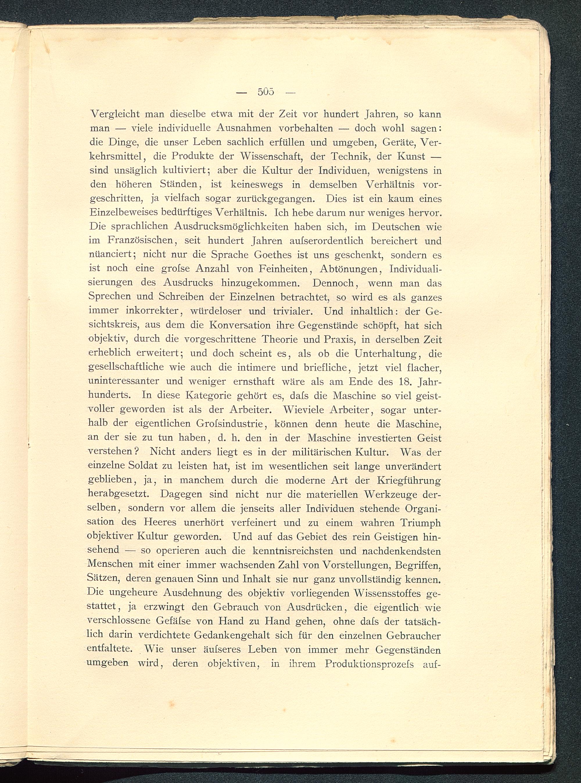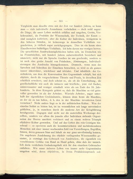 Vergleicht man dieselbe etwa mit der Zeit vor hundert Jahren, so kannman — viele individuelle Ausnahmen Vorbehalten — doch wohl sagen:die Dinge, die unser Leben sachlich erfüllen und umgeben, Geräte, Ver-kehrsmittel, die Produkte der Wissenschaft, der Technik, der Kunst —sind unsäglich kultiviert; aber die Kultur der Individuen, wenigstens inden höheren Ständen, ist keineswegs in demselben Verhältnis vor-geschritten, ja vielfach sogar zurückgegangen. Dies ist ein kaum einesEinzelbeweises bedürftiges Verhältnis. Ich hebe darum nur weniges hervor.Die sprachlichen Ausdrucksmöglichkeiten haben sich, im Deutschen wieim Französischen, seit hundert Jahren aufserordentlich bereichert undnuanciert; nicht nur die Sprache Goethes ist uns geschenkt, sondern esist noch eine grofse Anzahl von Feinheiten, Abtönungen, Individuali-sierungen des Ausdrucks hinzugekommen. Dennoch, wenn man dasSprechen und Schreiben der Einzelnen betrachtet, so wird es als ganzesimmer inkorrekter, würdeloser und trivialer. Und inhaltlich: der Ge-sichtskreis, aus dem die Konversation ihre Gegenstände schöpft, hat sichobjektiv, durch die vorgeschrittene Theorie und Praxis, in derselben Zeiterheblich erweitert; und doch scheint es, als ob die Unterhaltung, diegesellschaftliche wie auch die intimere und briefliche, jetzt viel flacher,uninteressanter und weniger ernsthaft wäre als am Ende des 18. Jahr-hunderts. In diese Kategorie gehört es, dafs die Maschine so viel geist-voller geworden ist als der Arbeiter. Wieviele Arbeiter, sogar unter-halb der eigentlichen Grofsindustrie, können denn heute die Maschine,an der sie zu tun haben, d. h. den in der Maschine investierten Geistverstehen ? Nicht anders liegt es in der militärischen Kultur. Was dereinzelne Soldat zu leisten hat, ist im wesentlichen seit lange unverändertgeblieben, ja, in manchem durch die moderne Art der Kriegführungherabgesetzt. Dagegen sind nicht nur die materiellen Werkzeuge der-selben, sondern vor allem die jenseits aller Individuen stehende Organi-sation des Heeres unerhört verfeinert und zu einem wahren Triumphobjektiver Kultur geworden. Und auf das Gebiet des rein Geistigen hin-sehend — so operieren auch die kenntnisreichsten und nachdenkendstenMenschen mit einer immer wachsenden Zahl von Vorstellungen, Begriffen,Sätzen, deren genauen Sinn und Inhalt sie nur ganz unvollständig kennen.Die ungeheure Ausdehnung des objektiv vorliegenden Wissensstoffes ge-stattet, ja erzwingt den Gebrauch von Ausdrücken, die eigentlich wieverschlossene Gefäfse von Hand zu Hand gehen, ohne dafs der tatsäch-lich darin verdichtete Gedankengehalt sich für den einzelnen Gebraucherentfaltete. Wie unser äufseres Leben von immer mehr Gegenständenumgeben wird, deren objektiven, in ihrem Produktionsprozefs auf-