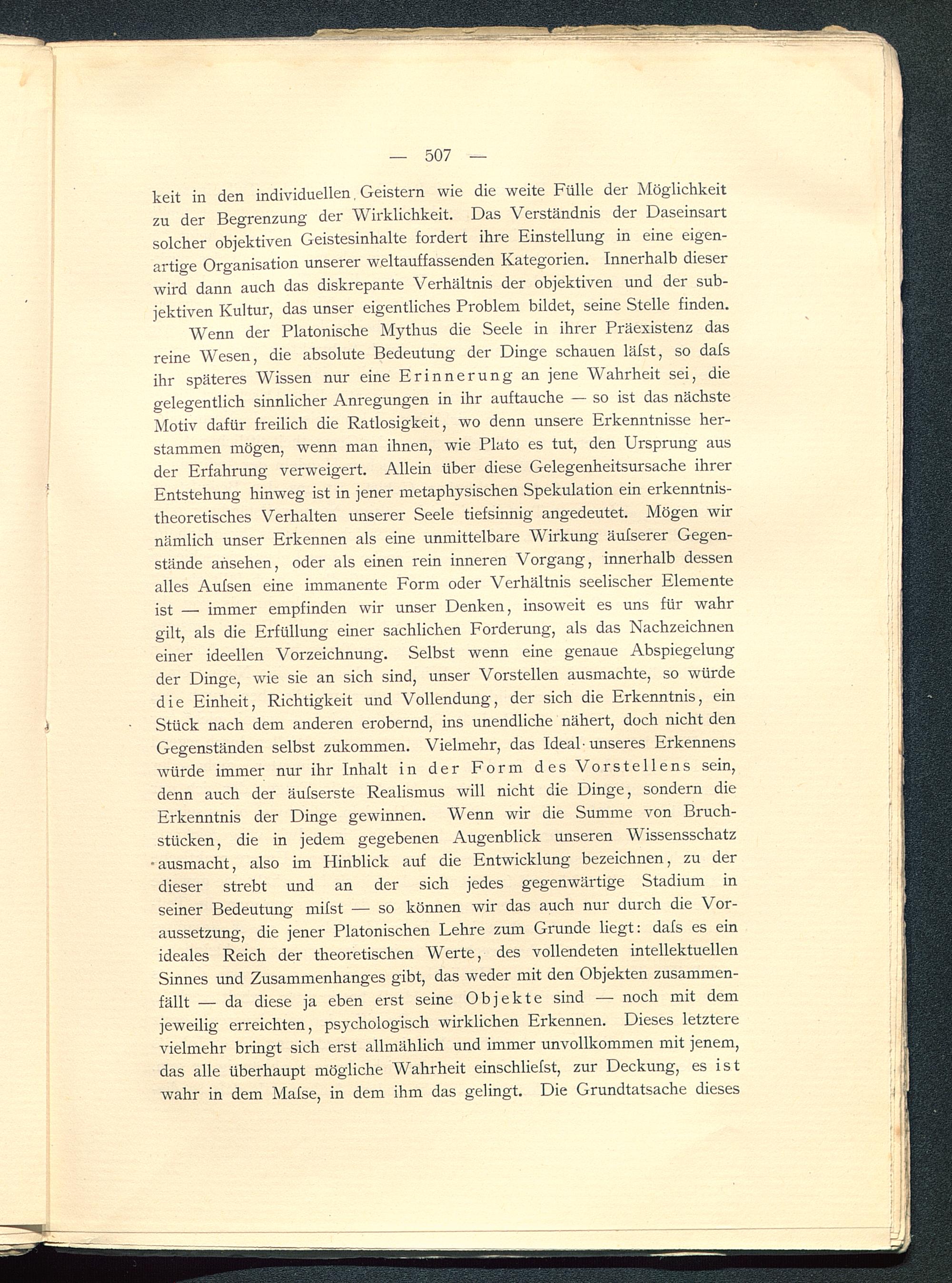 Wenn der Platonische Mythus die Seele in ihrer Präexistenz dasreine Wesen, die absolute Bedeutung der Dinge schauen läfst, so dafsihr späteres Wissen nur eine Erinnerung an jene Wahrheit sei, diegelegentlich sinnlicher Anregungen in ihr auftauche — so ist das nächsteMotiv dafür freilich die Ratlosigkeit, wo denn unsere Erkenntnisse her-stammen mögen, wenn man ihnen, wie Plato es tut, den Ursprung ausder Erfahrung verweigert. Allein über diese Gelegenheitsursache ihrerEntstehung hinweg ist in jener metaphysischen Spekulation ein erkenntnis-theoretisches Verhalten unserer Seele tiefsinnig angedeutet. Mögen wirnämlich unser Erkennen als eine unmittelbare Wirkung äufserer Gegen-stände ansehen, oder als einen rein inneren Vorgang, innerhalb dessenalles Aufsen eine immanente Form oder Verhältnis seelischer Elementeist — immer empfinden wir unser Denken, insoweit es uns für wahrgilt, als die Erfüllung einer sachlichen Forderung, als das Nachzeichneneiner ideellen Vorzeichnung. Selbst wenn eine genaue Abspiegelungder Dinge, wie sie an sich sind, unser Vorstellen ausmachte, so würdedie Einheit, Richtigkeit und Vollendung, der sich die Erkenntnis, einStück nach dem anderen erobernd, ins unendliche nähert, doch nicht denGegenständen selbst zukommen. Vielmehr, das Ideal-unseres Erkennenswürde immer nur ihr Inhalt in der Form des Vorstellens sein,denn auch der äufserste Realismus will nicht die Dinge, sondern dieErkenntnis der Dinge gewinnen. Wenn wir die Summe von Bruch-stücken, die in jedem gegebenen Augenblick unseren Wissensschatzausmacht, also im Hinblick auf die Entwicklung bezeichnen, zu derdieser strebt und an der sich jedes gegenwärtige Stadium inseiner Bedeutung mifst — so können wir das auch nur durch die Vor-aussetzung, die jener Platonischen Lehre zum Grunde liegt: dafs es einideales Reich der theoretischen Werte, des vollendeten intellektuellenSinnes und Zusammenhanges gibt, das weder mit den Objekten zusammen-fällt — da diese ja eben erst seine Objekte sind — noch mit demjeweilig erreichten, psychologisch wirklichen Erkennen. Dieses letzterevielmehr bringt sich erst allmählich und immer unvollkommen mit jenem,das alle überhaupt mögliche Wahrheit einschliefst, zur Deckung, es istwahr in dem Mafse, in dem ihm das gelingt. Die Grundtatsache dieses