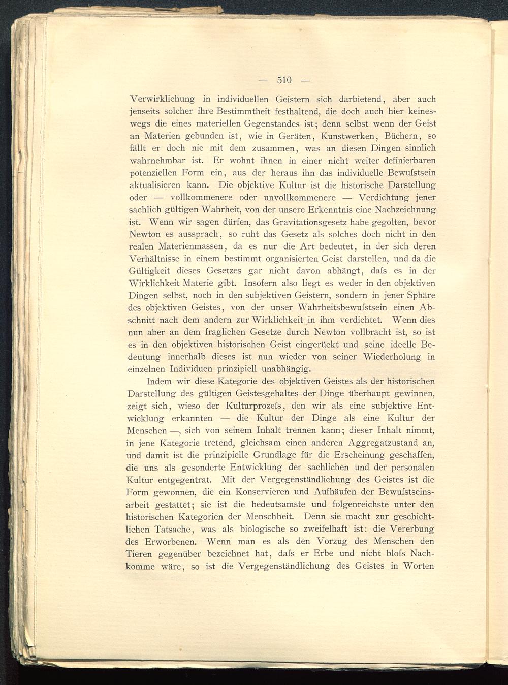 Indem wir diese Kategorie des objektiven Geistes als der historischenDarstellung des gültigen Geistesgehaltes der Dinge überhaupt gewinnen,zeigt sich, wieso der Kulturprozefs, den wir als eine subjektive Ent-wicklung erkannten — die Kultur der Dinge als eine Kultur derMenschen —, sich von seinem Inhalt trennen kann; dieser Inhalt nimmt,in jene Kategorie tretend, gleichsam einen anderen Aggregatzustand an,und damit ist die prinzipielle Grundlage für die Erscheinung geschaffen,die uns als gesonderte Entwicklung der sachlichen und der personalenKultur entgegentrat. Mit der Vergegenständlichung des Geistes ist dieForm gewannen, die ein Konservieren und Aufhäufen der Bewufstseins-arbeit gestattet; sie ist die bedeutsamste und folgenreichste unter denhistorischen Kategorien der Menschheit. Denn sie macht zur geschicht-lichen Tatsache, was als biologische so zweifelhaft ist: die Vererbungdes Erworbenen. Wenn man es als den Vorzug des Menschen denTieren gegenüber bezeichnet hat, dafs er Erbe und nicht blofs Nach-komme wäre, so ist die Vergegenständlichung des Geistes in Worten