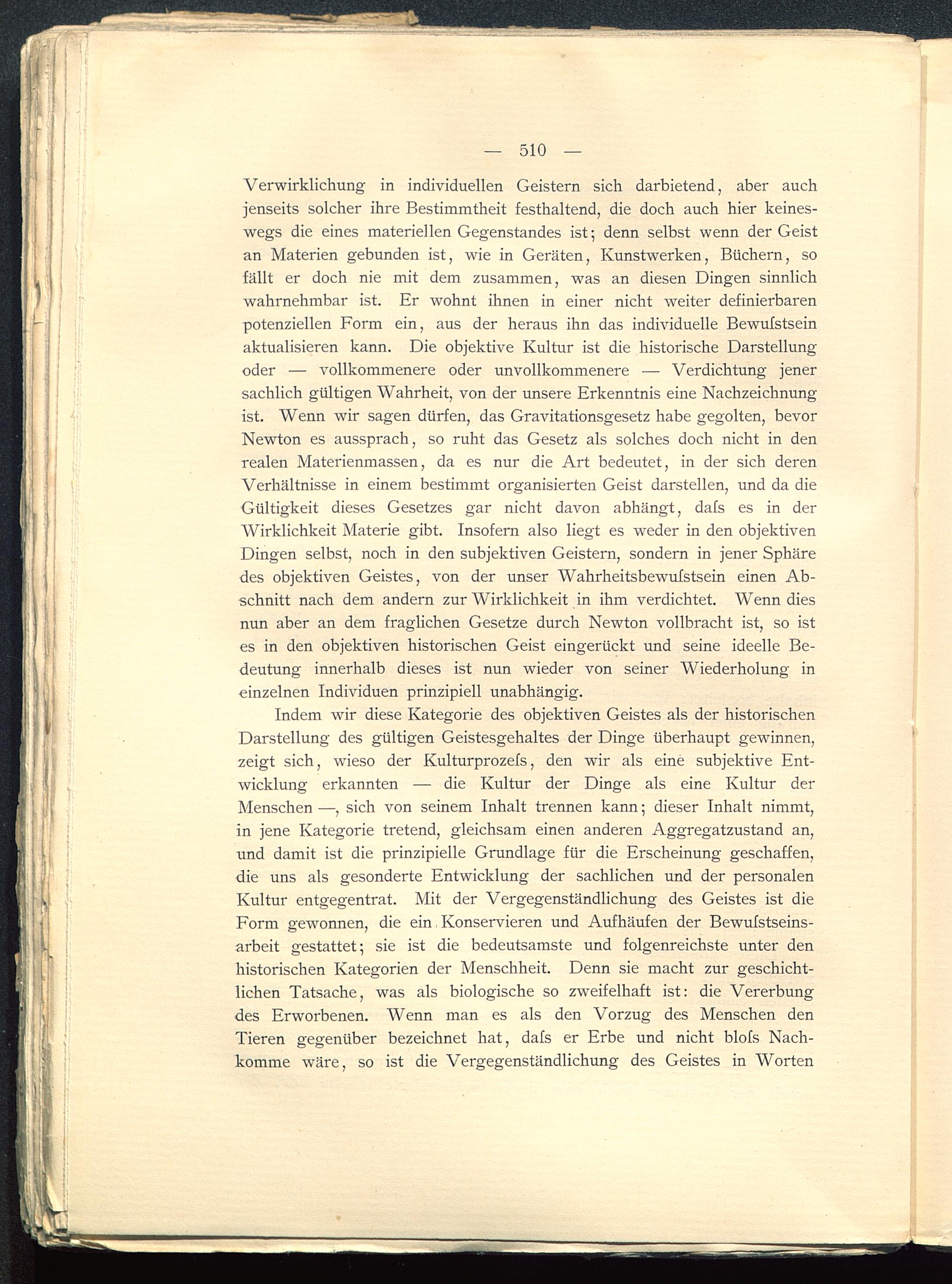 Verwirklichung in individuellen Geistern sich darbietend, aber auchjenseits solcher ihre Bestimmtheit festhaltend, die doch auch hier keines-wegs die eines materiellen Gegenstandes ist; denn selbst wenn der Geistan Materien gebunden ist, wie in Geräten, Kunstwerken, Büchern, sofällt er doch nie mit dem zusammen, was an diesen Dingen sinnlichwahrnehmbar ist. Er wohnt ihnen in einer nicht weiter definierbarenpotenziellen Form ein, aus der heraus ihn das individuelle Bewufstseinaktualisieren kann. Die objektive Kultur ist die historische Darstellungoder — vollkommenere oder unvollkommenere — Verdichtung jenersachlich gültigen Wahrheit, von der unsere Erkenntnis eine Nachzeichnungist. Wenn wir sagen dürfen, das Gravitationsgesetz habe gegolten, bevorNewton es aussprach, so ruht das Gesetz als solches doch nicht in denrealen Materienmassen, da es nur die Art bedeutet, in der sich derenVerhältnisse in einem bestimmt organisierten Geist darstellen, und da dieGültigkeit dieses Gesetzes gar nicht davon abhängt, dafs es in derWirklichkeit Materie gibt. Insofern also liegt es wieder in den objektivenDingen selbst, noch in den subjektiven Geistern, sondern in jener Sphäredes objektiven Geistes, von der unser Wahrheitsbewufstsein einen Ab-schnitt nach dem andern zur Wirklichkeit in ihm verdichtet. Wenn diesnun aber an dem fraglichen Gesetze durch Newton vollbracht ist, so istes in den objektiven historischen Geist eingerückt und seine ideelle Be-deutung innerhalb dieses ist nun wieder von seiner Wiederholung ineinzelnen Individuen prinzipiell unabhängig.