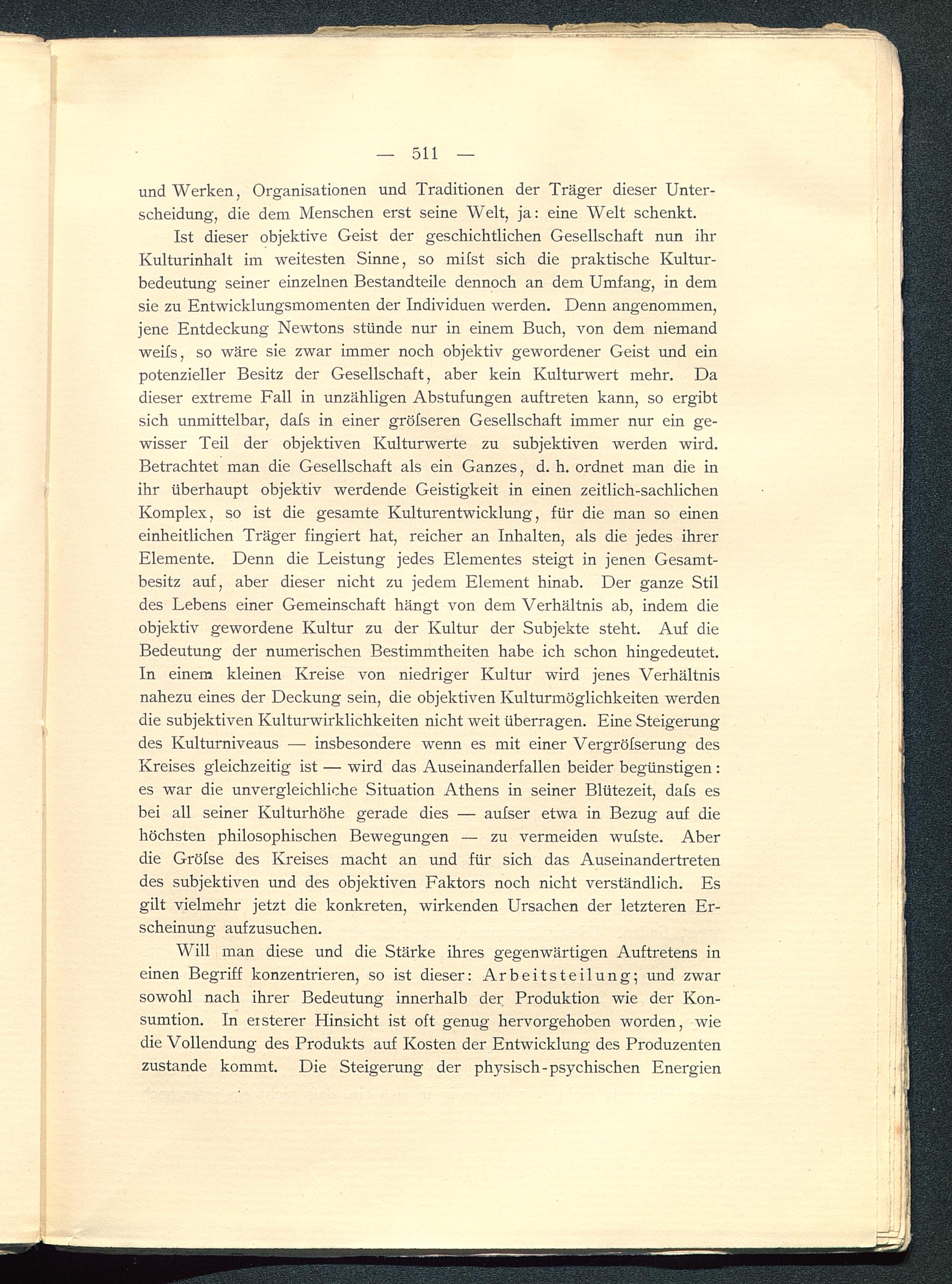 Ist dieser objektive Geist der geschichtlichen Gesellschaft nun ihrKulturinhalt im weitesten Sinne, so mifst sich die praktische Kultur-bedeutung seiner einzelnen Bestandteile dennoch an dem Umfang, in demsie zu Entwicklungsmomenten der Individuen werden. Denn angenommen,jene Entdeckung Newtons stünde nur in einem Buch, von dem niemandweifs, so wäre sie zwar immer noch objektiv gewordener Geist und einpotenzieller Besitz der Gesellschaft, aber kein Kulturwert mehr. Dadieser extreme Fall in unzähligen Abstufungen auftreten kann, so ergibtsich unmittelbar, dafs in einer gröfseren Gesellschaft immer nur ein ge-wisser Teil der objektiven Kulturwerte zu subjektiven werden wird.Betrachtet man die Gesellschaft als ein Ganzes, d. h. ordnet man die inihr überhaupt objektiv werdende Geistigkeit in einen zeitlich-sachlichenKomplex, so ist die gesamte Kulturentwicklung, für die man so eineneinheitlichen Träger fingiert hat, reicher an Inhalten, als die jedes ihrerElemente. Denn die Leistung jedes Elementes steigt in jenen Gesamt-besitz auf, aber dieser nicht zu jedem Element hinab. Der ganze Stildes Lebens einer Gemeinschaft hängt von dem Verhältnis ab, indem dieobjektiv gewordene Kultur zu der Kultur der Subjekte steht. Auf dieBedeutung der numerischen Bestimmtheiten habe ich schon hingedeutet.In einem kleinen Kreise von niedriger Kultur wird jenes Verhältnisnahezu eines der Deckung sein, die objektiven Kulturmöglichkeiten werdendie subjektiven Kulturwirklichkeiten nicht weit überragen. Eine Steigerungdes Kulturniveaus — insbesondere wenn es mit einer Vergröfserung desKreises gleichzeitig ist — wird das Auseinanderfallen beider begünstigen :es war die unvergleichliche Situation Athens in seiner Blütezeit, dafs esbei all seiner Kulturhöhe gerade dies — aufser etwa in Bezug auf diehöchsten philosophischen Bewegungen — zu vermeiden wufste. Aberdie Gröfse des Kreises macht an und für sich das Auseinandertretendes subjektiven und des objektiven Faktors noch nicht verständlich. Esgilt vielmehr jetzt die konkreten, wirkenden Ursachen der letzteren Er-scheinung aufzusuchen.