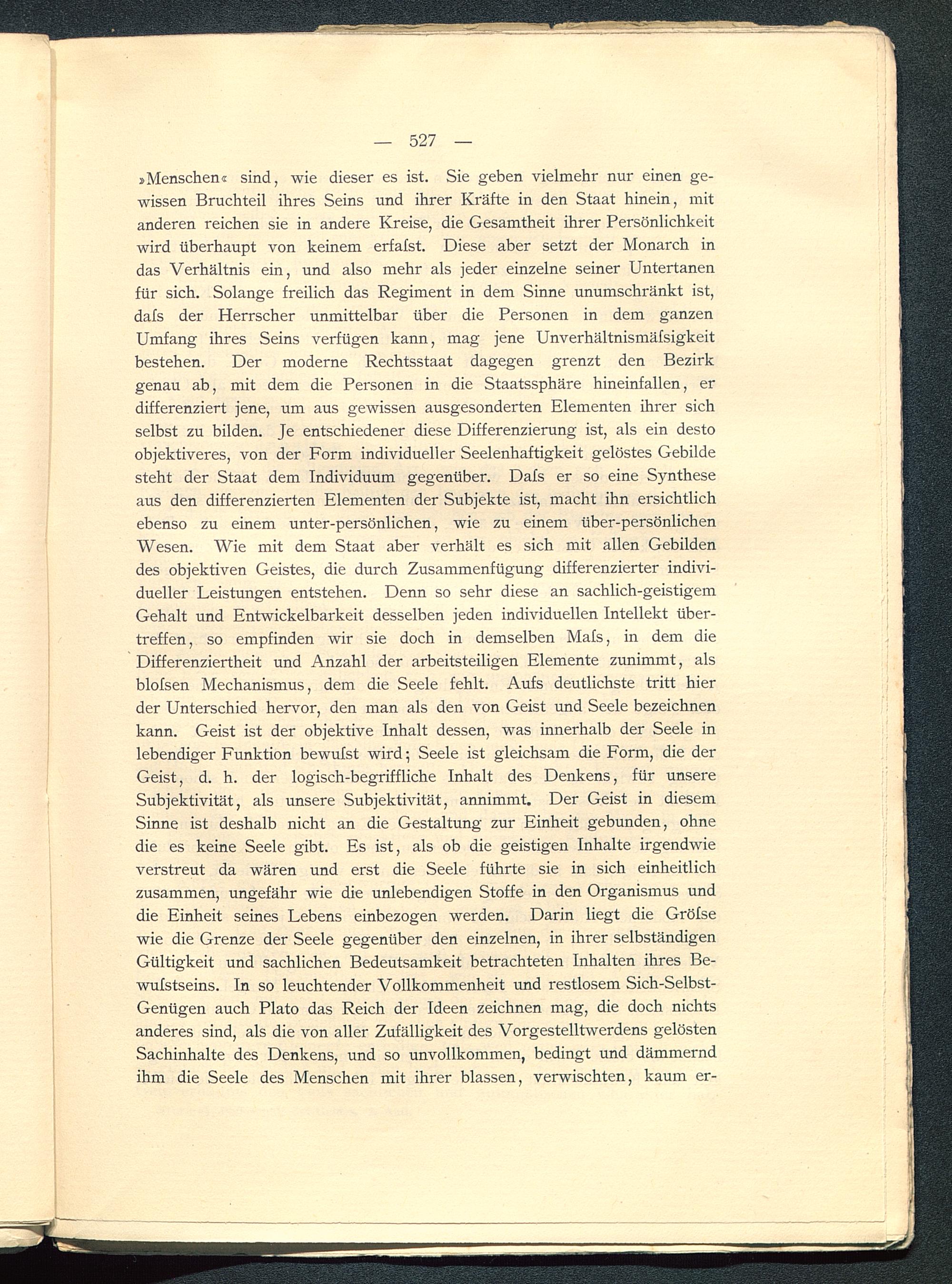 »Menschen« sind, wie dieser es ist. Sie geben vielmehr nur einen ge-wissen Bruchteil ihres Seins und ihrer Kräfte in den Staat hinein, mitanderen reichen sie in andere Kreise, die Gesamtheit ihrer Persönlichkeitwird überhaupt von keinem erfafst. Diese aber setzt der Monarch indas Verhältnis ein, und also mehr als jeder einzelne seiner Untertanenfür sich. Solange freilich das Regiment in dem Sinne unumschränkt ist,dafs der Herrscher unmittelbar über die Personen in dem ganzenUmfang ihres Seins verfügen kann, mag jene Unverhältnismäfsigkeitbestehen. Der moderne Rechtsstaat dagegen grenzt den Bezirkgenau ab, mit dem die Personen in die Staatssphäre hineinfallen, erdifferenziert jene, um aus gewissen ausgesonderten Elementen ihrer sichselbst zu bilden. Je entschiedener diese Differenzierung ist, als ein destoobjektiveres, von der Form individueller Seelenhaftigkeit gelöstes Gebildesteht der Staat dem Individuum gegenüber. Dafs er so eine Syntheseaus den differenzierten Elementen der Subjekte ist, macht ihn ersichtlichebenso zu einem unter-persönlichen, wie zu einem über-persönlichenWesen. Wie mit dem Staat aber verhält es sich mit allen Gebildendes objektiven Geistes, die durch Zusammenfügung differenzierter indivi-dueller Leistungen entstehen. Denn so sehr diese an sachlich-geistigemGehalt und Entwickelbarkeit desselben jeden individuellen Intellekt über-treffen, so empfinden wir sie doch in demselben Mafs, in dem dieDifferenziertheit und Anzahl der arbeitsteiligen Elemente zunimmt, alsblofsen Mechanismus, dem die Seele fehlt. Aufs deutlichste tritt hierder Unterschied hervor, den man als den von Geist und Seele bezeichnenkann. Geist ist der objektive Inhalt dessen, was innerhalb der Seele inlebendiger Funktion bewulst wird; Seele ist gleichsam die Form, die derGeist, d. h. der logisch-begriffliche Inhalt des Denkens, für unsereSubjektivität, als unsere Subjektivität, annimmt. Der Geist in diesemSinne ist deshalb nicht an die Gestaltung zur Einheit gebunden, ohnedie es keine Seele gibt. Es ist, als ob die geistigen Inhalte irgendwieverstreut da wären und erst die Seele führte sie in sich einheitlichzusammen, ungefähr wie die unlebendigen Stoffe in den Organismus unddie Einheit seines Lebens einbezogen werden. Darin liegt die Gröfsewie die Grenze der Seele gegenüber den einzelnen, in ihrer selbständigenGültigkeit und sachlichen Bedeutsamkeit betrachteten Inhalten ihres Be-wufstseins. In so leuchtender Vollkommenheit und restlosem Sich-Selbst-Genügen auch Plato das Reich der Ideen zeichnen mag, die doch nichtsanderes sind, als die von aller Zufälligkeit des Vorgestelltwerdens gelöstenSachinhalte des Denkens, und so unvollkommen, bedingt und dämmerndihm die Seele des Menschen mit ihrer blassen, verwischten, kaum er-