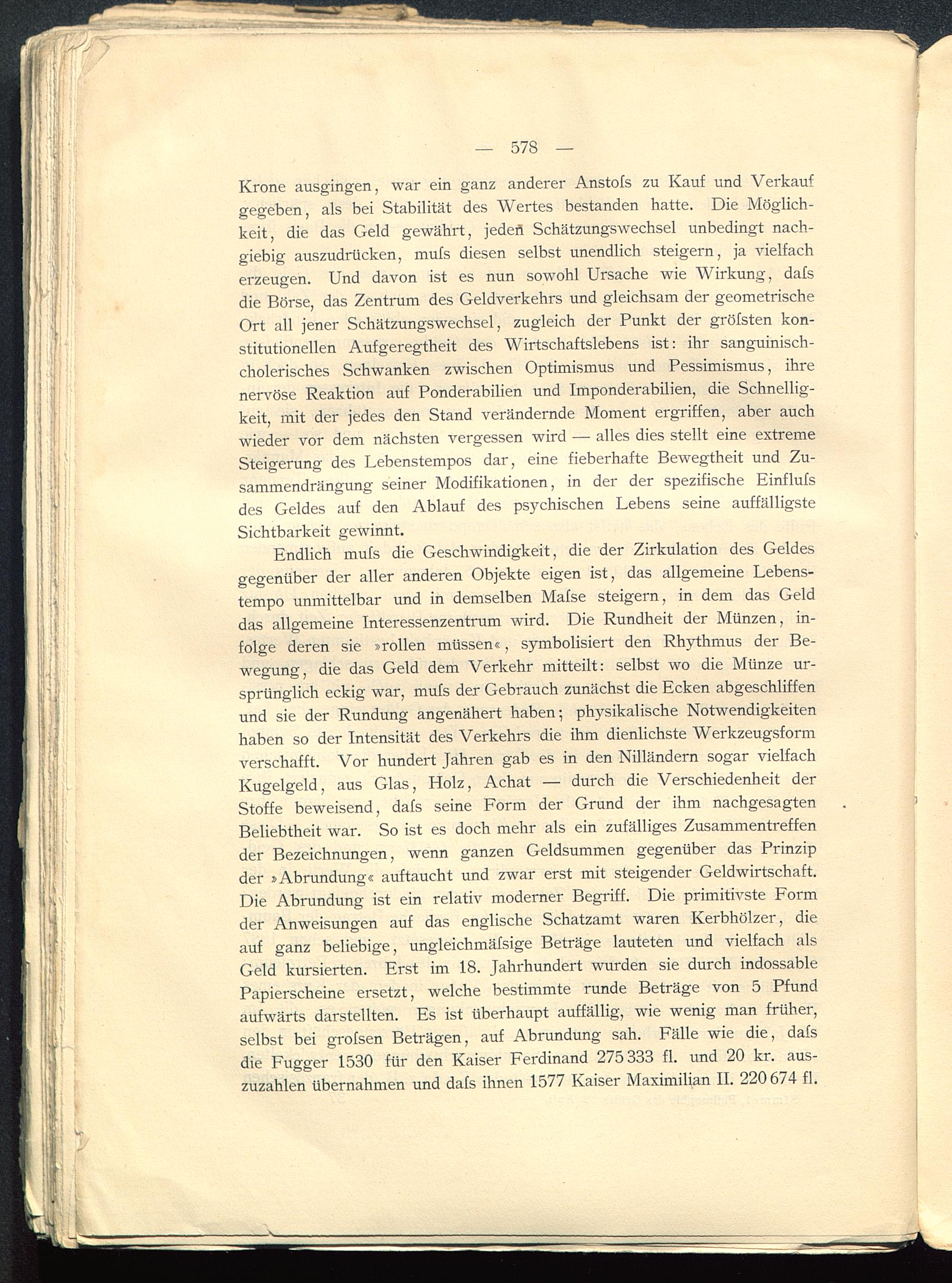 Endlich mufs die Geschwindigkeit, die der Zirkulation des Geldesgegenüber der aller anderen Objekte eigen ist, das allgemeine Lebens-tempo unmittelbar und in demselben Mafse steigern, in dem das Gelddas allgemeine Interessenzentrum wird. Die Rundheit der Münzen, in-folge deren sie »rollen müssen«, symbolisiert den Rhythmus der Be-wegung, die das Geld dem Verkehr mitteilt: selbst wo die Münze ur-sprünglich eckig war, mufs der Gebrauch zunächst die Ecken abgeschliffenund sie der Rundung angenähert haben; physikalische Notwendigkeitenhaben so der Intensität des Verkehrs die ihm dienlichste Werkzeugsformverschafft. Vor hundert Jahren gab es in den Nilländern sogar vielfachKugelgeld, aus Glas, Holz, Achat — durch die Verschiedenheit derStoffe beweisend, dafs seine Form der Grund der ihm nachgesagtenBeliebtheit war. So ist es doch mehr als ein zufälliges Zusammentreffender Bezeichnungen, wenn ganzen Geldsummen gegenüber das Prinzipder »Abrundung« auftaucht und zwar erst mit steigender Geldwirtschaft.Die Abrundung ist ein relativ moderner Begriff. Die primitivste Formder Anweisungen auf das englische Schatzamt waren Kerbhölzer, dieauf ganz beliebige, ungleichmäfsige Beträge lauteten und vielfach alsGeld kursierten. Erst im 18. Jahrhundert wurden sie durch indossablePapierscheine ersetzt, welche bestimmte runde Beträge von 5 Pfundaufwärts darstellten. Es ist überhaupt auffällig, wie wenig man früher,selbst bei grofsen Beträgen, auf Abrundung sah. Fälle wie die, dafsdie Fugger 1530 für den Kaiser Ferdinand 275 333 fl. und 20 kr. aus-zuzahlen übernahmen und dafs ihnen 1577 Kaiser Maximilian II. 220 674 fl.