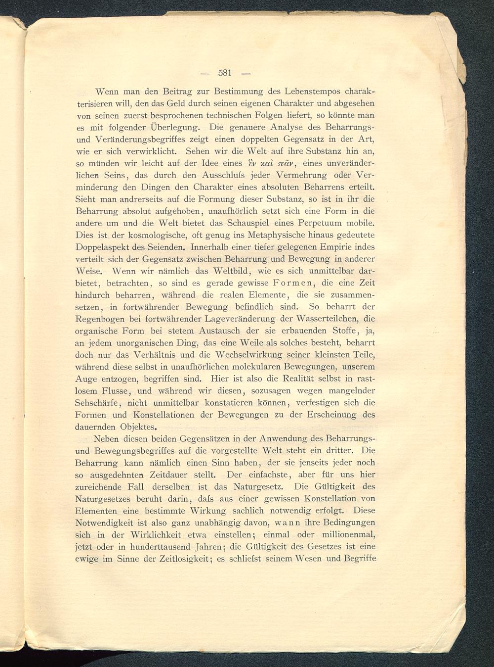 Wenn man den Beitrag zur Bestimmung des Lebenstempos charak-terisieren will, den das Geld durch seinen eigenen Charakter und abgesehenvon seinen zuerst besprochenen technischen Folgen liefert, so könnte manes mit folgender Überlegung. Die genauere Analyse des Beharrungs-und Veränderungsbegriffes zeigt einen doppelten Gegensatz in der Art,wie er sich verwirklicht. Sehen wir die Welt auf ihre Substanz hin an,so münden wir leicht auf der Idee eines sv v.ai näv , eines unveränder-lichen Seins, das durch den Ausschlufs jeder Vermehrung oder Ver-minderung den Dingen den Charakter eines absoluten Beharrens erteilt.Sieht man andrerseits auf die Formung dieser Substanz, so ist in ihr dieBeharrung absolut aufgehoben, unaufhörlich setzt sich eine Form in dieandere um und die Welt bietet das Schauspiel eines Perpetuum mobile.Dies ist der kosmologische, oft genug ins Metaphysische hinaus gedeuteteDoppelaspekt des Seienden. Innerhalb einer tiefer gelegenen Empirie indesverteilt sich der Gegensatz zwischen Beharrung und Bewegung in andererWeise. Wenn wir nämlich das Weltbild, wie es sich unmittelbar dar-bietet, betrachten, so sind es gerade gewisse Formen, die eine Zeithindurch beharren, während die realen Elemente, die sie zusammen-setzen, in fortwährender Bewegung befindlich sind. So beharrt derRegenbogen bei fortwährender Lageveränderung der Wasserteilchen, dieorganische Form bei stetem Austausch der sie erbauenden Stoffe, ja,an jedem unorganischen Ding, das eine Weile als solches besteht, beharrtdoch nur das Verhältnis und die Wechselwirkung seiner kleinsten Teile,während diese selbst in unaufhörlichen molekularen Bewegungen, unseremAuge entzogen, begriffen sind. Hier ist also die Realität selbst in rast-losem Flusse, und während wir diesen, sozusagen wegen mangelnderSehschärfe, nicht unmittelbar konstatieren können, verfestigen sich dieFormen und Konstellationen der Bewegungen zu der Erscheinung desdauernden Objektes.