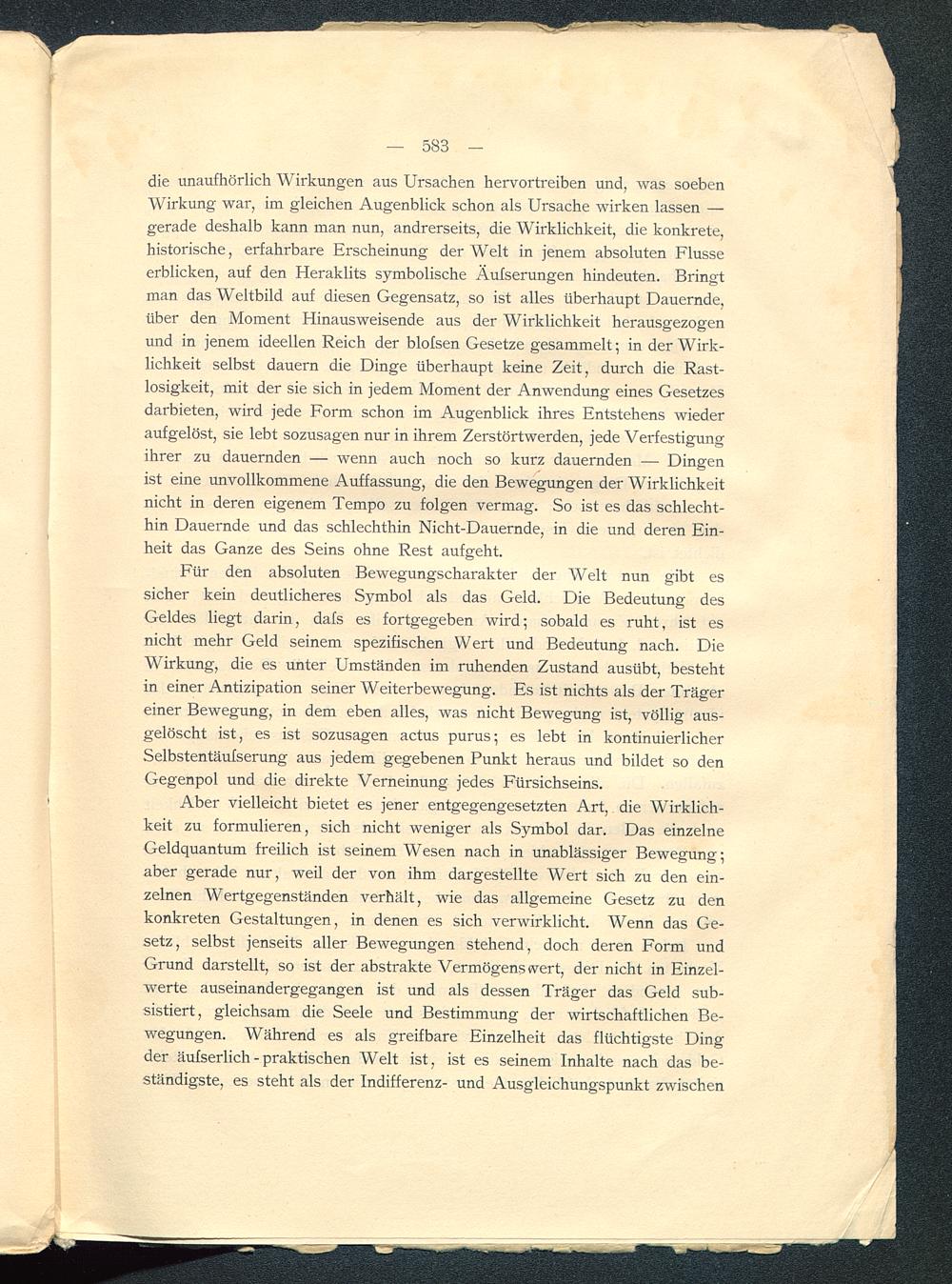 Aber vielleicht bietet es jener entgegengesetzten Art, die Wirklich-keit zu formulieren, sich nicht weniger als Symbol dar. Das einzelneGeldquantum freilich ist seinem Wesen nach in unablässiger Bewegung;aber gerade nur, weil der von ihm dargestellte Wert sich zu den ein-zelnen Wertgegenständen verhält, wie das allgemeine Gesetz zu denkonkreten Gestaltungen, in denen es sich verwirklicht. Wenn das Ge-setz, selbst jenseits aller Bewegungen stehend, doch deren Form undGrund darstellt, so ist der abstrakte Vermögens wert, der nicht in Einzel-werte auseinandergegangen ist und als dessen Träger das Geld sub-sistiert, gleichsam die Seele und Bestimmung der wirtschaftlichen Be-wegungen. Während es als greifbare Einzelheit das flüchtigste Dingder äufserlich - praktischen Welt ist, ist es seinem Inhalte nach das be-ständigste, es steht als der Indifferenz- und Ausgleichungspunkt zwischen