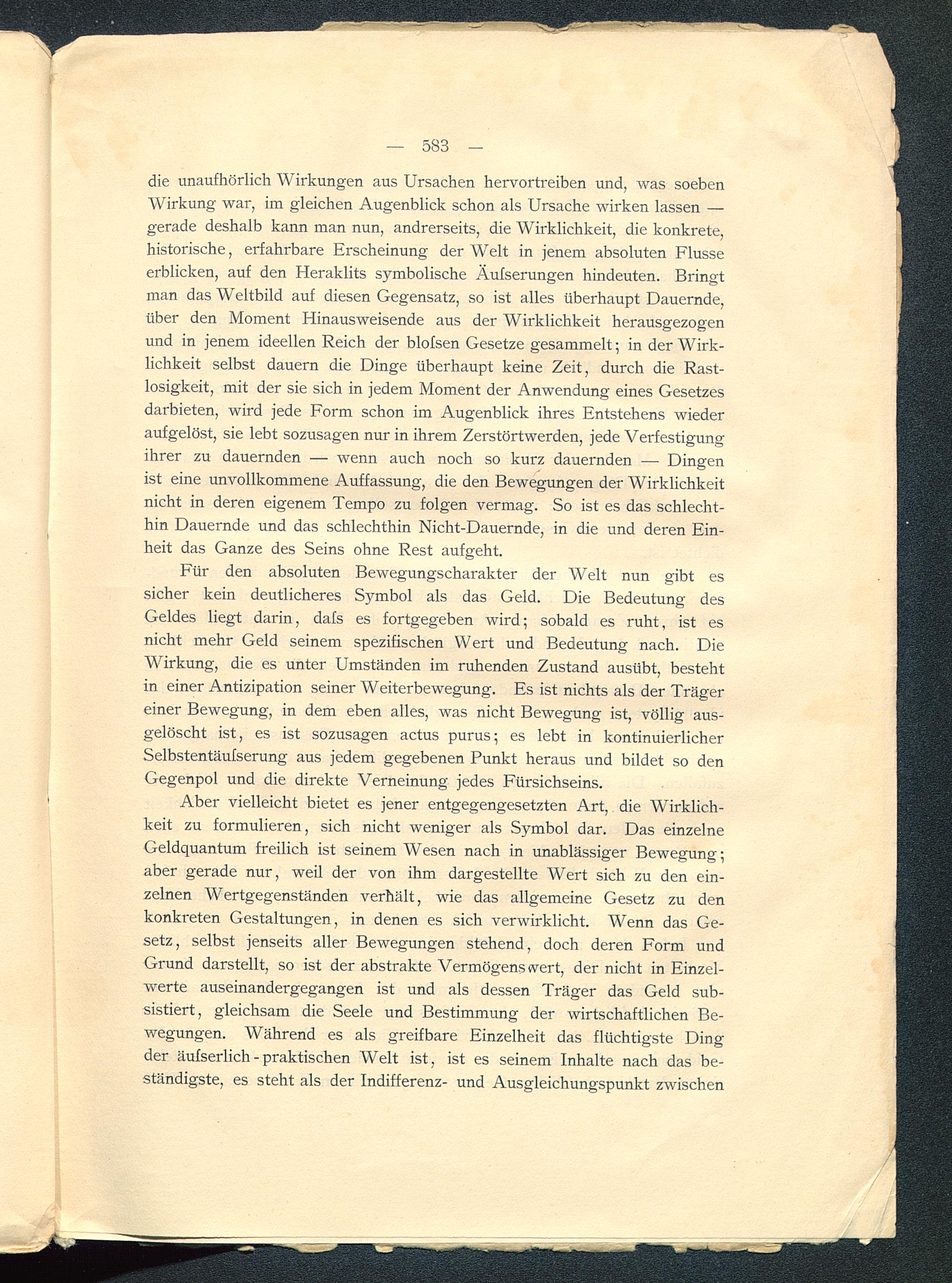 Für den absoluten Bewegungscharakter der Welt nun gibt essicher kein deutlicheres Symbol als das Geld. Die Bedeutung desGeldes liegt darin, dafs es fortgegeben wird; sobald es ruht, ist esnicht mehr Geld seinem spezifischen Wert und Bedeutung nach. DieWirkung, die es unter Umständen im ruhenden Zustand ausübt, bestehtin einer Antizipation seiner Weiterbewegung. Es ist nichts als der Trägereiner Bewegung, in dem eben alles, was nicht Bewegung ist, völlig aus-gelöscht ist, es ist sozusagen actus purus; es lebt in kontinuierlicherSelbstentäufserung aus jedem gegebenen Punkt heraus und bildet so denGegenpol und die direkte Verneinung jedes Fürsichseins.