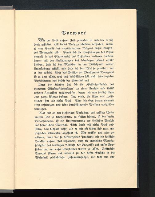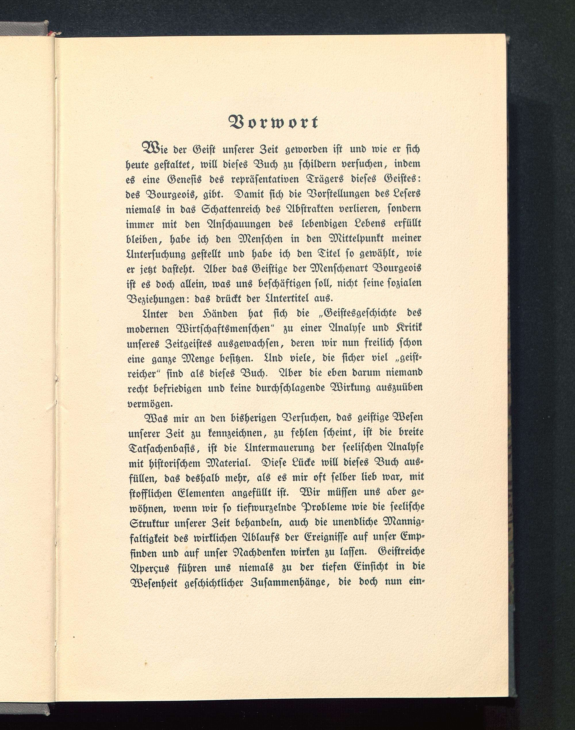 Ä5ie der Geist unserer Zeit geworden ist und wie er sichheute gestaltet, will dieses Buch zu schildern versuchen, indemes eine Genesis des repräsentativen Trägers dieses Geistes:des Bourgeois, gibt. Damit sich die Vorstellungen des Lesersniemals in das Schattenreich des Abstrakten verlieren, sondernimmer mit den Anschauungen des lebendigen Lebens erfülltbleiben, habe ich den Menschen in den Mittelpunkt meinerUntersuchung gestellt und habe ich den Titel so gewählt, wieer jetzt dasteht. Aber das Geistige der Menschenart Bourgeoisist es doch allein, was uns beschäftigen soll, nicht seine sozialenBeziehungen: das drückt der Untertitel aus.