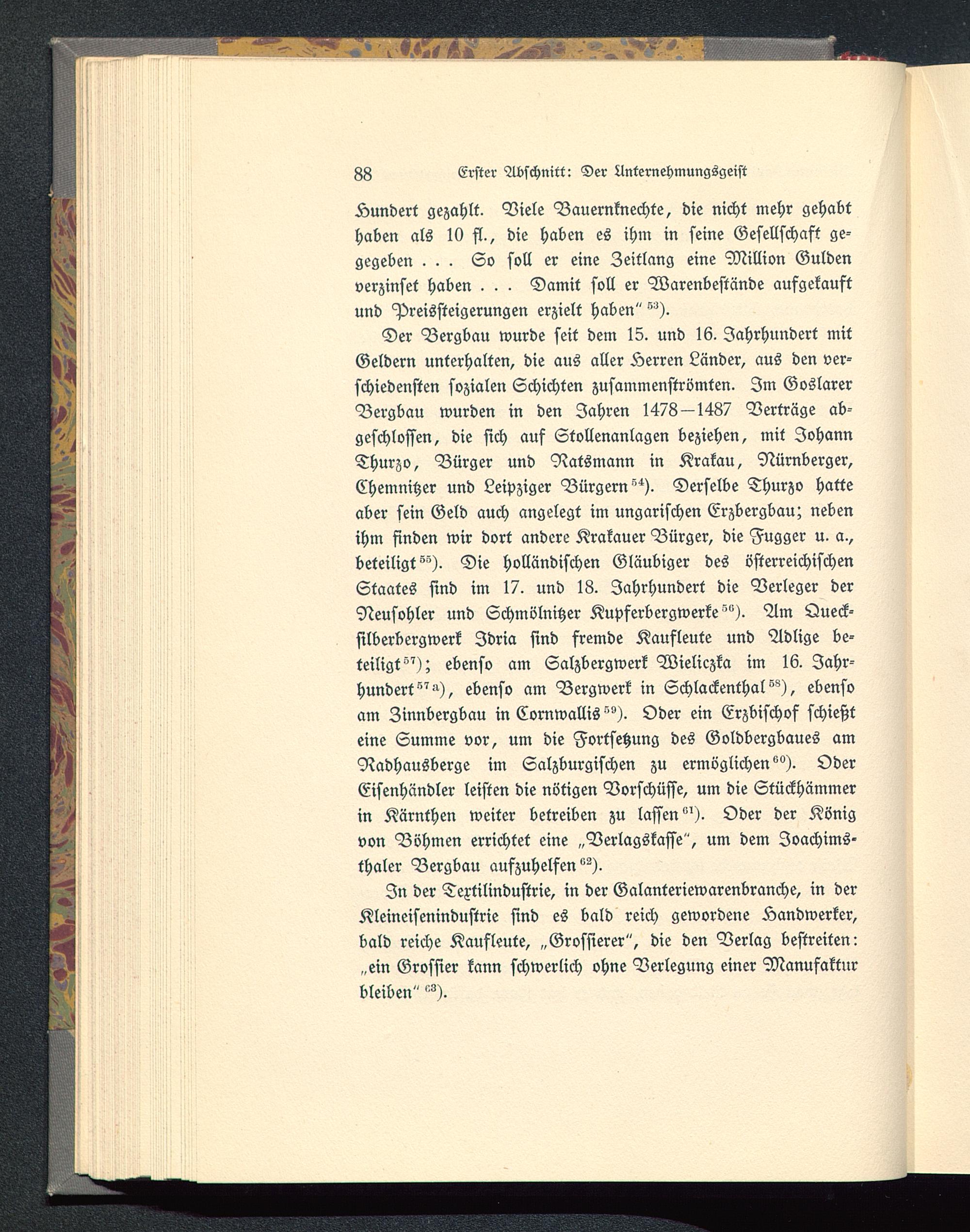 Der Bergbau wurde seit dem 15. und 16. Jahrhundert mitGeldern unterhalten, die aus aller Herren Länder, aus den ver-schiedensten sozialen Schichten zusammenströmten. Im Goslarer Bergbau wurden in den Iahren 1478—1487 Verträge ab-geschlossen, die sich auf Stollenanlagen beziehen, mit JohannThurzo, Bürger und Natsmann in Krakau , Nürnberger,Chemnitzer und Leipziger Bürgern^). Derselbe Thurzo hatteaber sein Geld auch angelegt im ungarischen Erzbergbau; nebenihm finden wir dort andere Krakauer Bürger, die Fugger u. a.,beteiligt^). Die holländischen Gläubiger des österreichischenStaates sind im 17. und 18. Jahrhundert die Verleger derNeusohler und Schmölnitzer Kupferbergwerke'"). Am Queck-silberbergwerk Idria sind fremde Kaufleute und Adlige be-teiligt^); ebenso am Salzbergwerk Wieliczka im 16. Jahr-hundert""), ebenso am Bergwerk in Schlackenthal ^), ebensoam Zinnbergbau in Cornwallis ^). Oder ein Erzbischof schießteine Summe vor, um die Fortsetzung des Goldbergbaues amRadhausberge im Salzburgischen zu ermöglichen °°). OderEisenhändler leisten die nötigen Vorschüsse, um die Stückhämmerin Kärnthen weiter betreiben zu lassen"'). Oder der Königvon Böhmen errichtet eine „Verlagskasse", um dem Joachims-thaler Bergbau aufzuhelfen^).