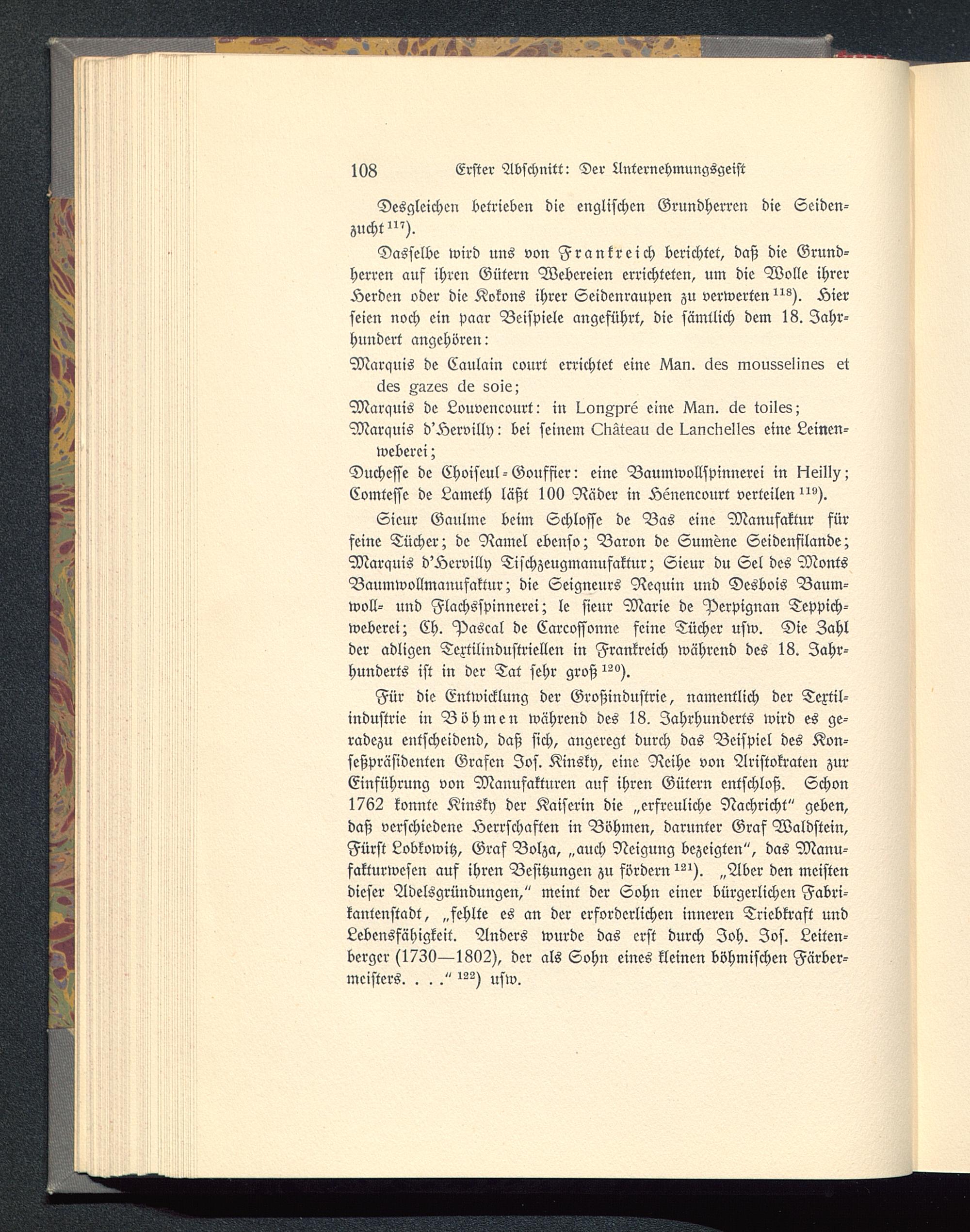 Sicur Gaulme beim Schlosse de Bas eine Manufaktur fürfeine Tücher; de Ramel ebenso; Baron de Sumene Seidenfilande;Marquis d'Kervilly Tischzeugmanufaktur; Sieur du Sel des MontsBaumwollmanufaktur; die Seigneurs Requin und Desbois Baum-woll- und Flachsspinnerei; le sieur Marie de Perpignan Teppich-weberei; Ch. Pascal de Carcossonne feine Tücher usw. Die Zahlder adligen Textilindustriellen in Frankreich während des 18. Jahr-hunderts ist in der Tat sehr groß ^°).