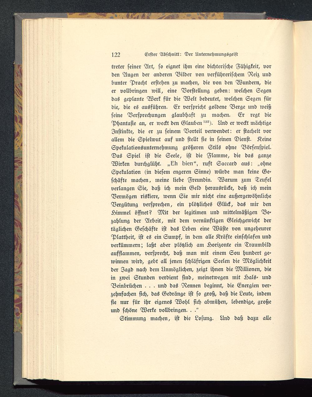 treter seiner Art, so eignet ihm eine dichterische Fähigkeit, vorden Augen der anderen Bilder von verführerischem Reiz undbunter Pracht erstehen zu machen, die von den Wundern, dieer vollbringen will, eine Vorstellung geben: welchen Segendas geplante Werk für die Welt bedeutet, welchen Segen fürdie, die es ausführen. Er verspricht goldene Berge und weißseine Versprechungen glaubhaft zu machen. Er regt diePhantasie an, er weckt den Glauben And er weckt mächtigeInstinkte, die er zu seinem Vorteil verwendet: er stachelt vorallem die Spielwut auf und stellt sie in seinen Dienst. KeineSpekulationsunternehmung größeren Stils ohne Börsenspiel.Das Spiel ist die Seele, ist die Flamme, die das ganzeWirken durchglüht. „Hn Kien", ruft Saccard aus: „ohneSpekulation (in diesem engeren Sinne) würde man keine Ge-schäfte machen, meine liebe Freundin. Warum zum Teufelverlangen Sie, daß ich mein Geld herausrücke, daß ich meinVermögen riskiere, wenn Sie mir nicht eine außergewöhnlicheVergütung versprechen, ein plötzliches Glück, das mir denÄimmel öffnet? Mit der legitimen und mittelmäßigen Be-zahlung der Arbeit, mit dem vernünftigen Gleichgewicht dertäglichen Geschäfte ist das Leben eine Wüste von ungeheurerPlattheit, ist es ein Sumpf, in dem alle Kräfte einschlafen undverkümmern; laßt aber plötzlich am Horizonte ein Traumbildaufflammen, versprecht, daß man mit einem Sou hundert ge-winnen wird, gebt all jenen schläfrigen Seelen die Möglichkeitder Jagd nach dem Anmöglichen, zeigt ihnen die Millionen, diein zwei Stunden verdient sind, meinetwegen mit Äals- undBeinbrüchen . . . und das Nennen beginnt, die Energien ver-zehnfachen sich, das Gedränge ist so groß, daß die Leute, indemsie nur für ihr eigenes Wohl sich abmühen, lebendige, großeund schöne Werke vollbringen. .