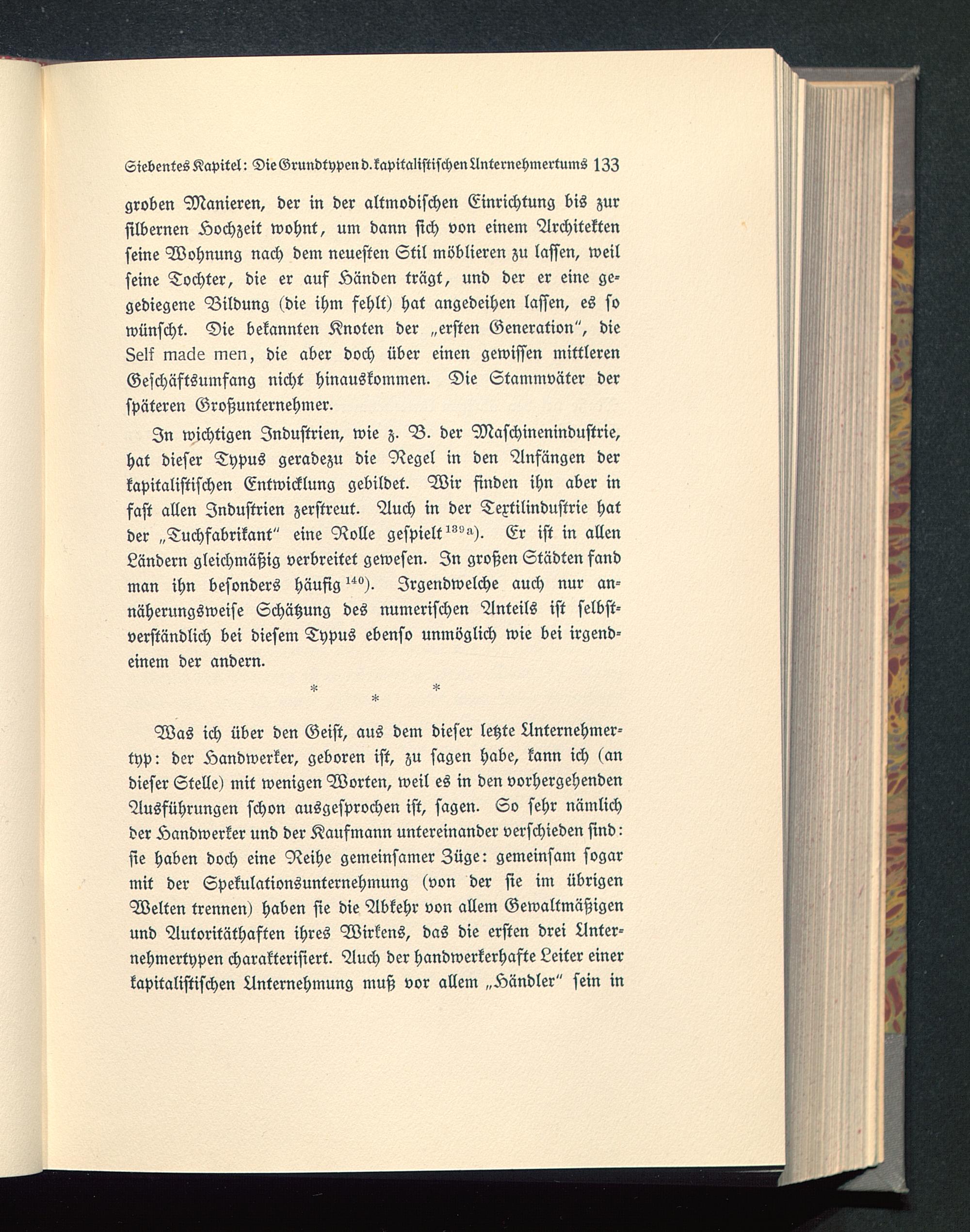 Was ich über den Geist, aus dem dieser letzte Anternehmer-typ: der Handwerker, geboren ist, zu sagen habe, kann ich (andieser Stelle) mit wenigen Worten, weil es in den vorhergehendenAusführungen schon ausgesprochen ist, sagen. So sehr nämlichder Handwerker und der Kaufmann untereinander verschieden sind:sie haben doch eine Reihe gemeinsamer Züge: gemeinsam sogarmit der Spekulationsunternehmung (von der sie im übrigenWelten trennen) haben sie die Abkehr von allem Gewaltmäßigenund Autoritäthaften ihres Wirkens, das die ersten drei Unter-nehmertypen charakterisiert. Auch der handwerkerhafte Leiter einerkapitalistischen Unternehmung muß vor allem „Händler" sein in