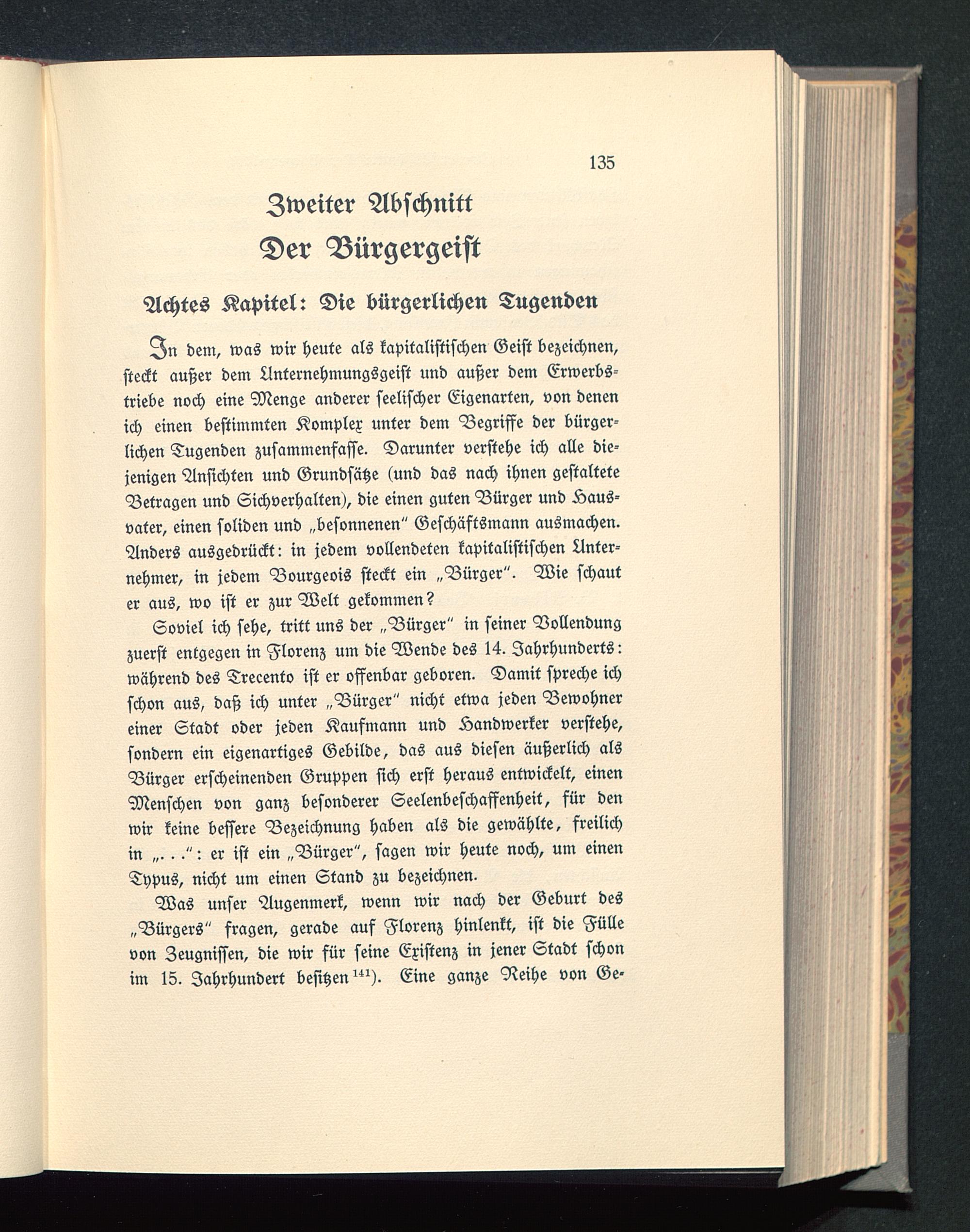 Soviel ich sehe, tritt uns der „Bürger" in seiner Vollendungzuerst entgegen in Florenz um die Wende des 14. Jahrhunderts:während des Trecento ist er offenbar geboren. Damit spreche ichschon aus, daß ich unter „Bürger" nicht etwa jeden Bewohnereiner Stadt oder jeden Kaufmann und Handwerker verstehe,sondern ein eigenartiges Gebilde, das aus diesen äußerlich alsBürger erscheinenden Gruppen sich erst heraus entwickelt, einenMenschen von ganz besonderer Seelenbeschaffenheit, für denwir keine bessere Bezeichnung haben als die gewählte, freilichin „...": er ist ein „Bürger", sagen wir heute noch, um einenTypus, nicht um einen Stand zu bezeichnen.