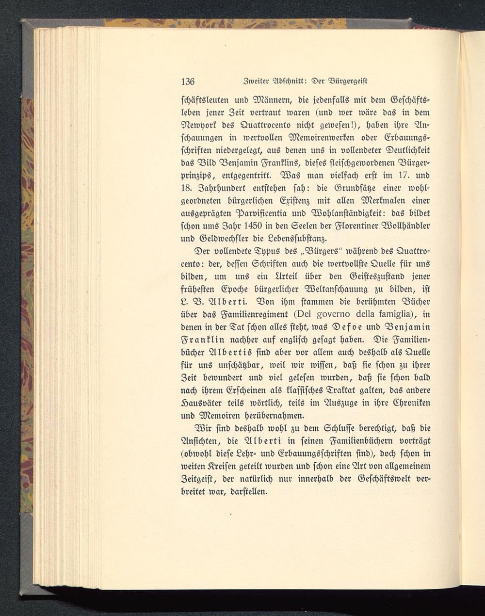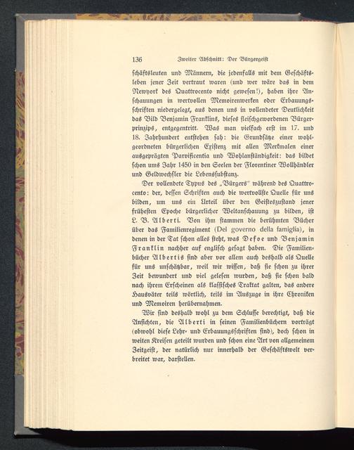 schäftsleuten und Männern, die jedenfalls mit dem Geschäfts-leben jener Zeit vertraut waren (und wer wäre das in demNewyork des Quattrocento nicht gewesen!), haben ihre An-schauungen in wertvollen Memoirenwerken oder Erbauungs-schriften niedergelegt, aus denen uns in vollendeter Deutlichkeitdas Bild Benjamin Franklins , dieses fleischgewordenen Bürger-prinzips, entgegentritt. Was man vielfach erst im 17. und18. Jahrhundert entstehen sah: die Grundsätze einer wohl-geordneten bürgerlichen Existenz mit allen Merkmalen einerausgeprägten Parvificentia und Wohlanständigkeit: das bildetschon ums Jahr 1450 in den Seelen der Florentiner Wollhändlerund Geldwechsler die Lebenssubstanz.