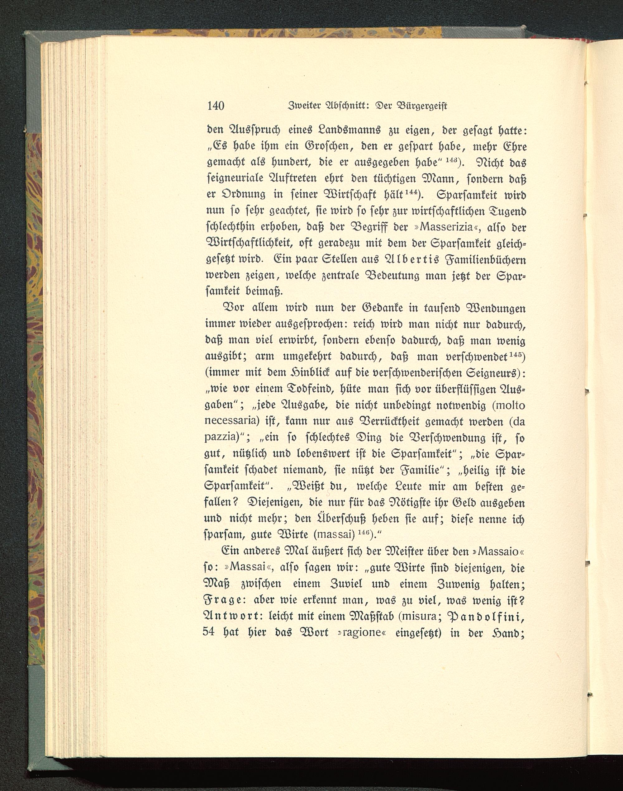 Vor allem wird nun der Gedanke in tausend Wendungenimmer wieder ausgesprochen: reich wird man nicht nur dadurch,daß man viel erwirbt, sondern ebenso dadurch, daß man wenigausgibt; arm umgekehrt dadurch, daß man verschwendet^)(immer mit dem Hinblick auf die verschwenderischen Seigneurs):„wie vor einem Todfeind, hüte man sich vor überflüssigen Aus-gaben"; „jede Ausgabe, die nicht unbedingt notwendig (molwneLessarm) ist, kann nur aus Verrücktheit gemacht werden (ciapg^lg)"; „ein so schlechtes Ding die Verschwendung ist, sogut, nützlich und lobenswert ist die Sparsamkeit"; „die Spar-samkeit schadet niemand, sie nützt der Familie"; „heilig ist dieSparsamkeit". „Weißt du, welche Leute mir am besten ge-fallen? Diejenigen, die nur für das Nötigste ihr Geld ausgebenund nicht mehr; den Überschuß heben sie auf; diese nenne ichsparsam, gute Wirte (massai)"«)."