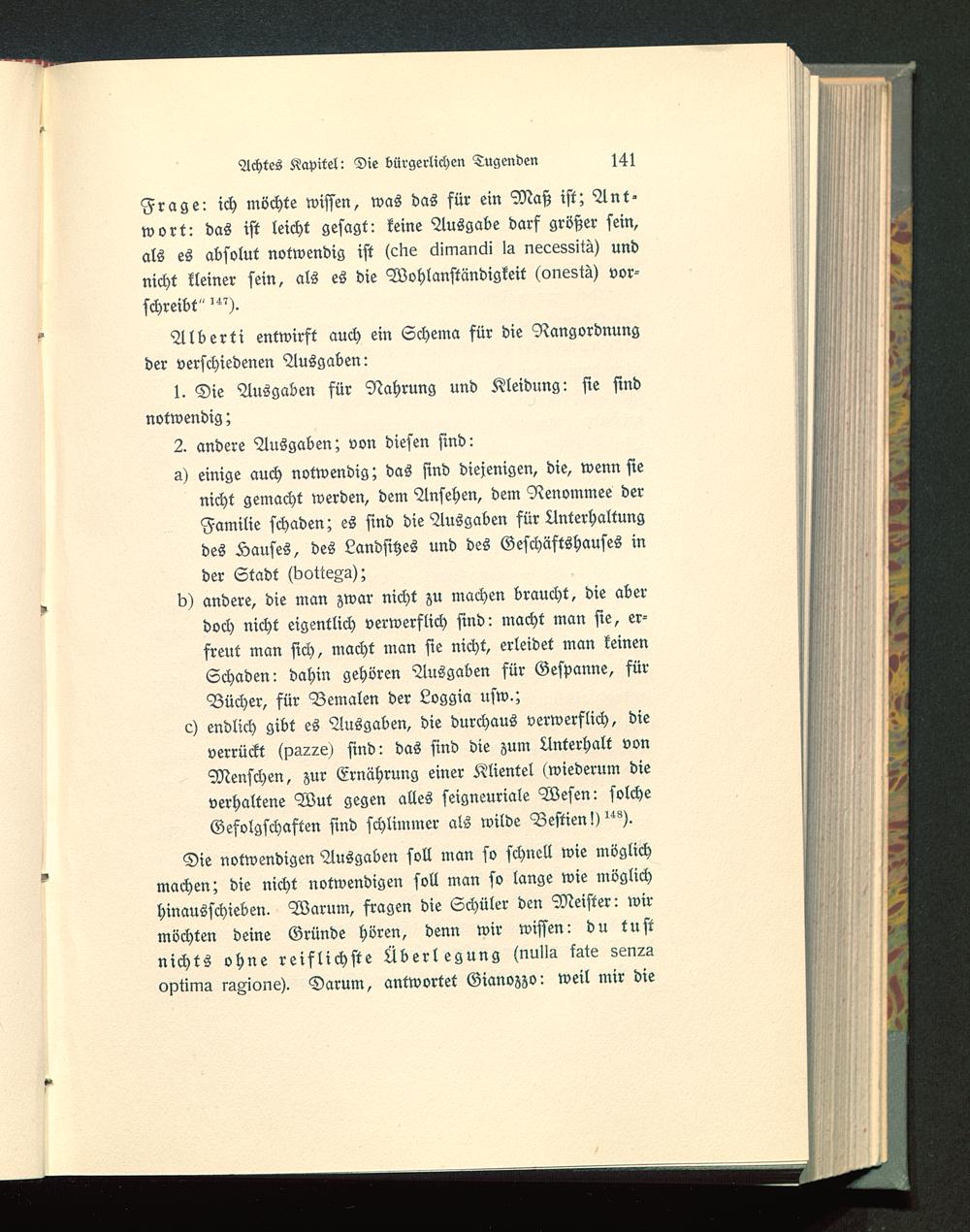 Die notwendigen Ausgaben soll man so schnell wie möglichmachen; die nicht notwendigen soll man so lange wie möglichhinausschieben. Warum, fragen die Schüler den Meister: wirmöchten deine Gründe hören, denn wir wissen: du tustnichts ohne reiflichste Überlegung (nulla tÄe sen?soptims ra^ione). Darum, antwortet Gianozzo: weil mir die