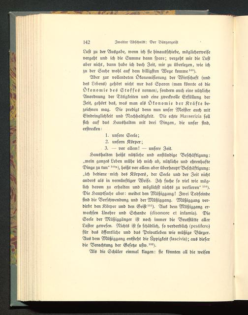 Haushalten heißt nützliche und anständige Beschäftigung:„mein ganzes Leben mühe ich mich ab, nützliche und ehrenhafteDinge zu tun" ""^), heißt vor allem aber überhaupt Beschäftigung:„ich bediene mich des Körpers, der Seele und der Zeit nichtanders als in vernünftiger Weise. Ich suche so viel wie mög-lich davon zu erhalten und möglichst nichts zu verlieren" ^°°).Die Hauptsache aber: meidet den Müßiggang I Zwei Todfeindesind die Verschwendung und der Müßiggang. Müßiggang ver-dirbt den Körper und den Geists). Aus dem Müßiggang er-wachsen Anehre und Schande (ciisonore et intamia). DieSeele der Müßiggänger ist noch immer die Brutstätte allerLaster gewesen. Nichts ist so schädlich, so verderblich lpestitero)für das öffentliche und das Privatleben wie müßige Bürger.Aus dem Müßiggang entsteht die Äppigkeit (wscivis); aus dieserdie Verachtung der Gesetze usw. ^).