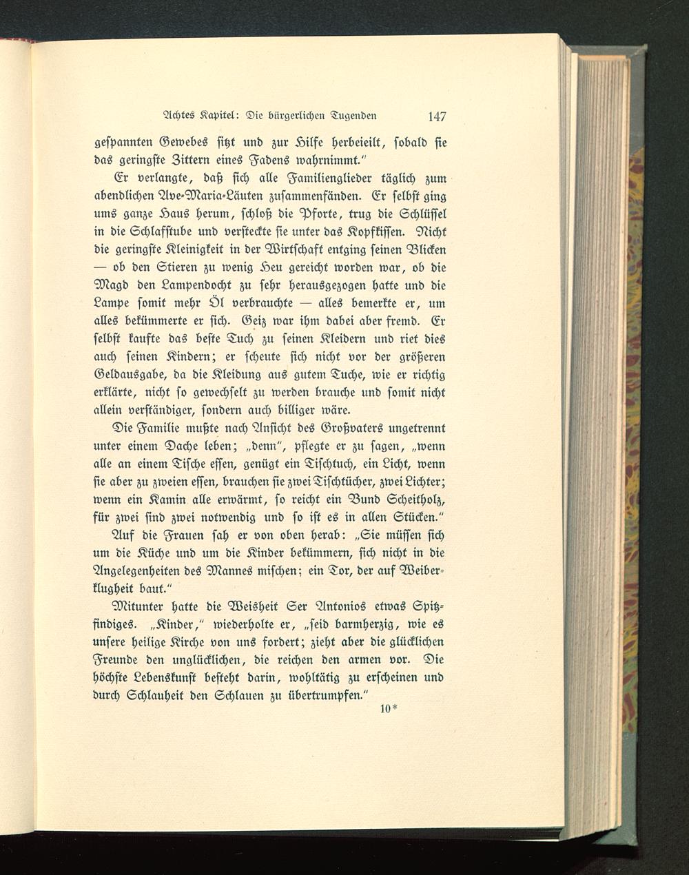 Mitunter hatte die Weisheit Ser Antonios etwas Spitz-findiges. „Kinder," wiederholte er, „seid barmherzig, wie esunsere heilige Kirche von uns fordert; zieht aber die glücklichenFreunde den unglücklichen, die reichen den armen vor. Diehöchste Lebenskunst besteht darin, wohltätig zu erscheinen unddurch Schlauheit den Schlauen zu übertrumpfen."