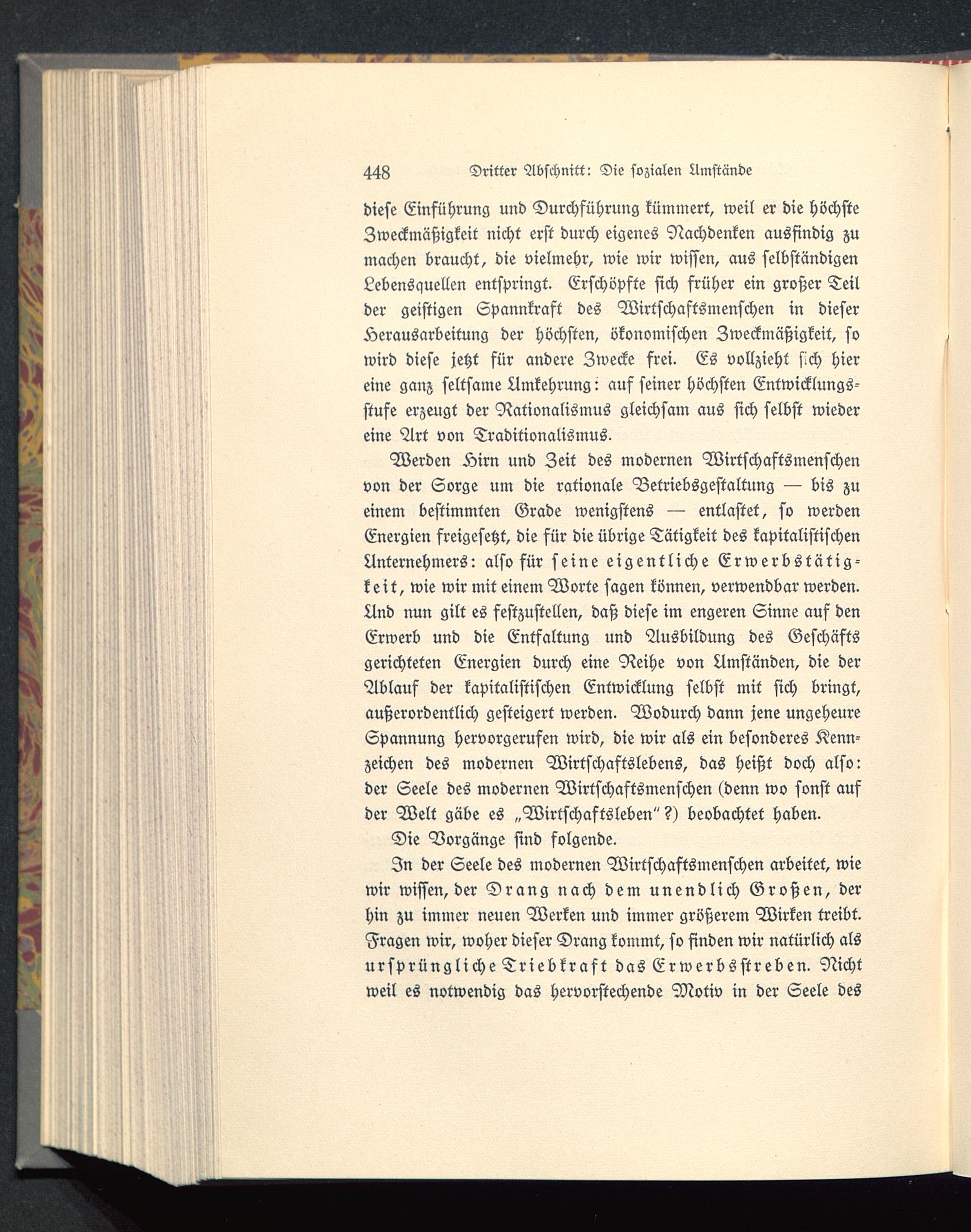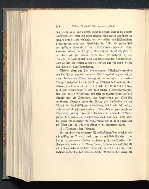In der Seele des modernen Wirtschaftsmenschen arbeitet, wiewir wissender Drang nach dem unendlich Großen, derhin zu immer neuen Werken und immer größerem Wirken treibt.Fragen wir, woher dieser Drang kommt, so finden wir natürlich alsursprüngliche Triebkraft das Erwerbsstreben. Nichtweil es notwendig das hervorstechende Motiv in der Seele des