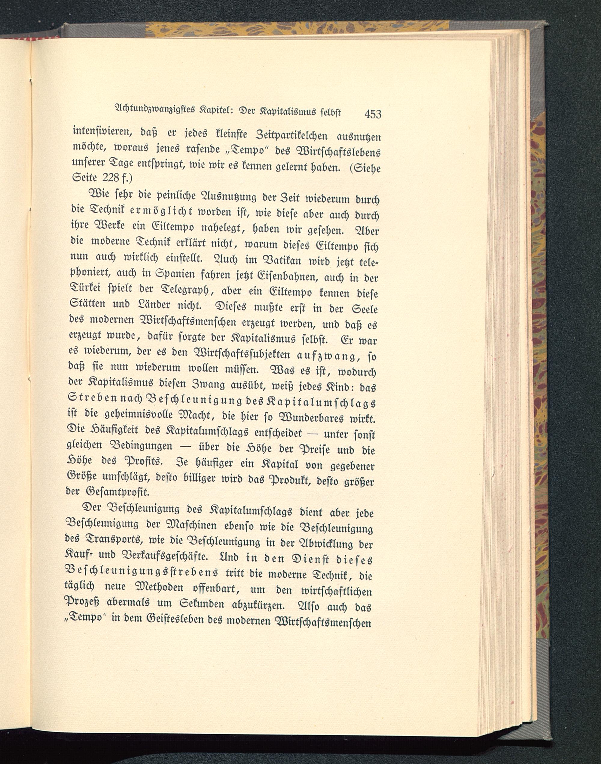 Wie sehr die peinliche Ausnutzung der Zeit wiederum durchdie Technik ermöglicht worden ist, wie diese aber auch durchihre Werke ein Eiltempo nahelegt, haben wir gesehen. Aberdie moderne Technik erklärt nicht, warum dieses Eiltempo sichnun auch wirklich einstellt. Auch im Vatikan wird jetzt tele-phoniert, auch in Spanien fahren jetzt Eisenbahnen, auch in derTürkei spielt der Telegraph, aber ein Eiltempo kennen dieseStätten und Länder nicht. Dieses mußte erst in der Seeledes modernen Wirtschaftsmenschen erzeugt werden, und daß eserzeugt wurde, dafür sorgte der Kapitalismus selbst. Er wares wiederum, der es den Wirtschaftssubjekten aufzwang, sodaß sie nun wiederum wollen müssen. Was es ist, wodurchder Kapitalismus diesen Zwang ausübt, weiß jedes Kind: dasStreben nach Beschleunigung des Kapitalumschlagsist die geheimnisvolle Macht, die hier so Wunderbares wirkt.Die Häufigkeit des Kapitalumschlags entscheidet — unter sonstgleichen Bedingungen — über die Äöhe der Preise und dieÄöhe des Profits. Je häufiger ein Kapital von gegebenerGröße umschlägt, desto billiger wird das Produkt, desto größerder Gesamtprofit.