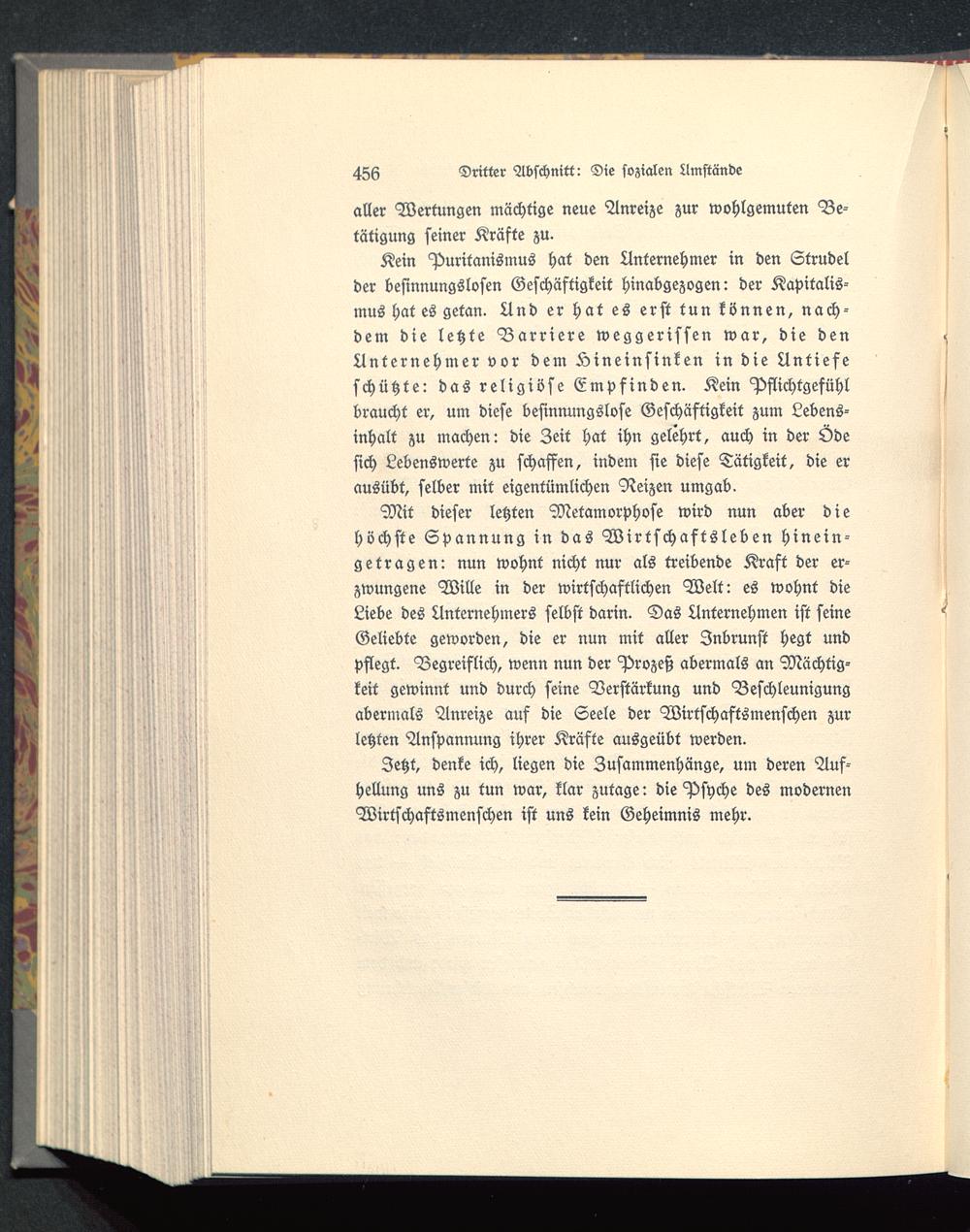 Mit dieser letzten Metamorphose wird nun aber diehöchste Spannung in das Wirtschaftsleben hinein-getragen: nun wohnt nicht nur als treibende Kraft der er-zwungene Wille in der wirtschaftlichen Welt: es wohnt dieLiebe des Unternehmers selbst darin. Das Unternehmen ist seineGeliebte geworden, die er nun mit aller Inbrunst hegt undpflegt. Begreiflich, wenn nun der Prozeß abermals an Mächtig-keit gewinnt und durch seine Verstärkung und Beschleunigungabermals Anreize auf die Seele der Wirtschaftsmenschen zurletzten Anspannung ihrer Kräfte ausgeübt werden.