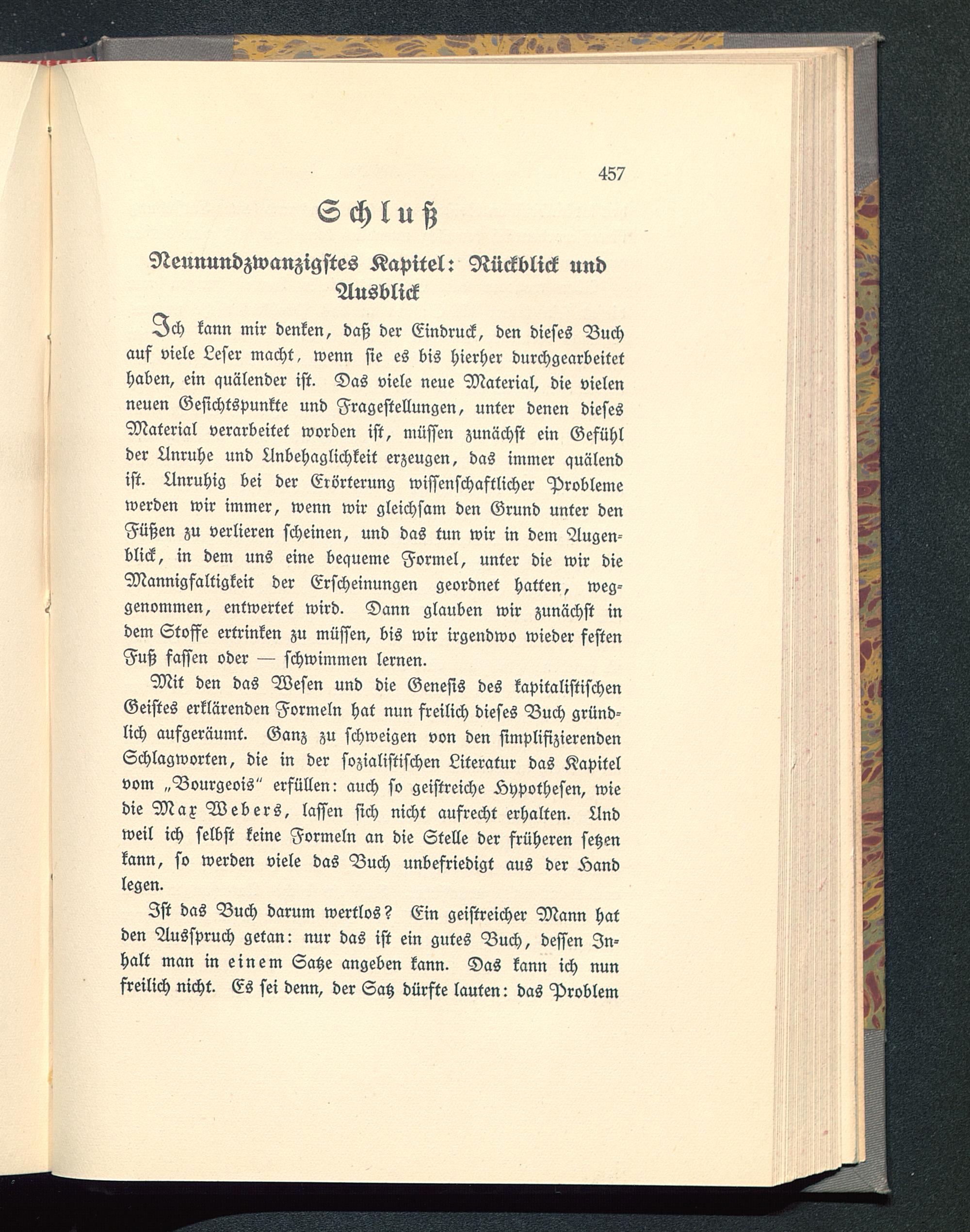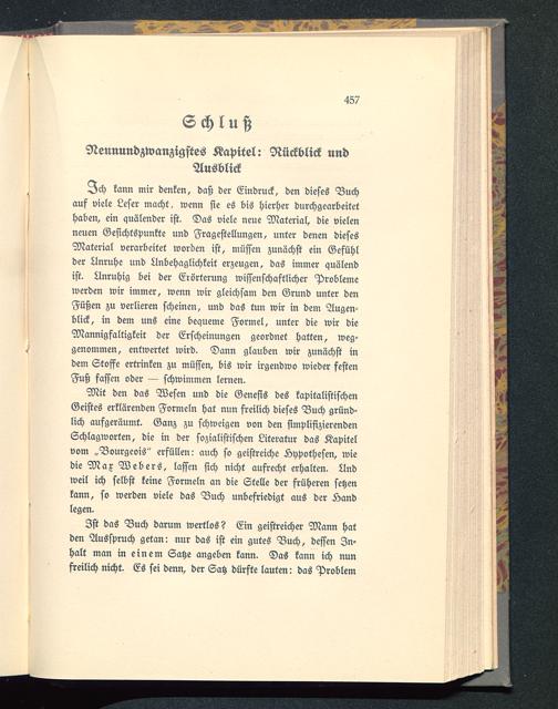 Mit den das Wesen und die Genesis des kapitalistischen Geistes erklärenden Formeln hat nun freilich dieses Buch gründ-lich aufgeräumt. Ganz zu schweigen von den simplifizierendenSchlagworten, die in der sozialistischen Literatur das Kapitelvom „Bourgeois" erfüllen: auch so geistreiche Hypothesen, wiedie Max Webers , lassen sich nicht aufrecht erhalten. Andweil ich selbst keine Formeln an die Stelle der früheren setzenkann, so werden viele das Buch unbefriedigt aus der Äandlegen.