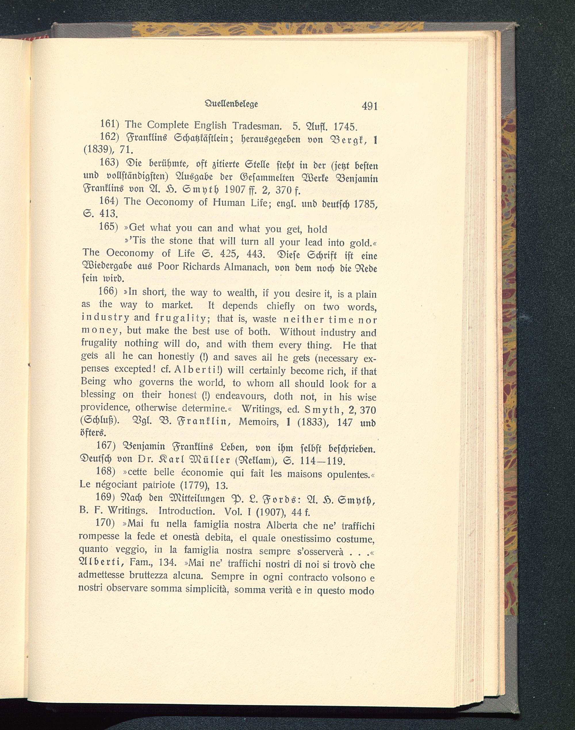 166) »In skort, tlie wa^ to vvealtb, ik )'0u äesire it, i8 a plainas tbe wa^ to market. lt clepencls cliiekl^ on tvvo worcls,inäustr^ an6 kru^alit^; tbat is, waste neillier time normone^, but mal<e tlie best use ol botb. >Vitbout industr^ an6fruZalit^ notninA will äo, ancl vvitn tnem ever)? tbinA. He tnatMts all ne can bonestl^ (!) ancl saves all be Zets (necessar)? ex-penses exceptecl! ck. ^ Iberti!) will certainl^ become ricli, il tkatLeinZ wbo Zoverns tbe worlcl, tc> wbom all slioulcl look lor ablessinA c>n tkeir lionest (!) eniZeavours, clotli not, in liis vviseproviclenee, otlierxvise 6etermine.« V^ritinM, ecl. Lm^tli, 2,370(Schluß). Vgl. B. Franklin , IVIemoirs, I (1833), 147 undöfters.