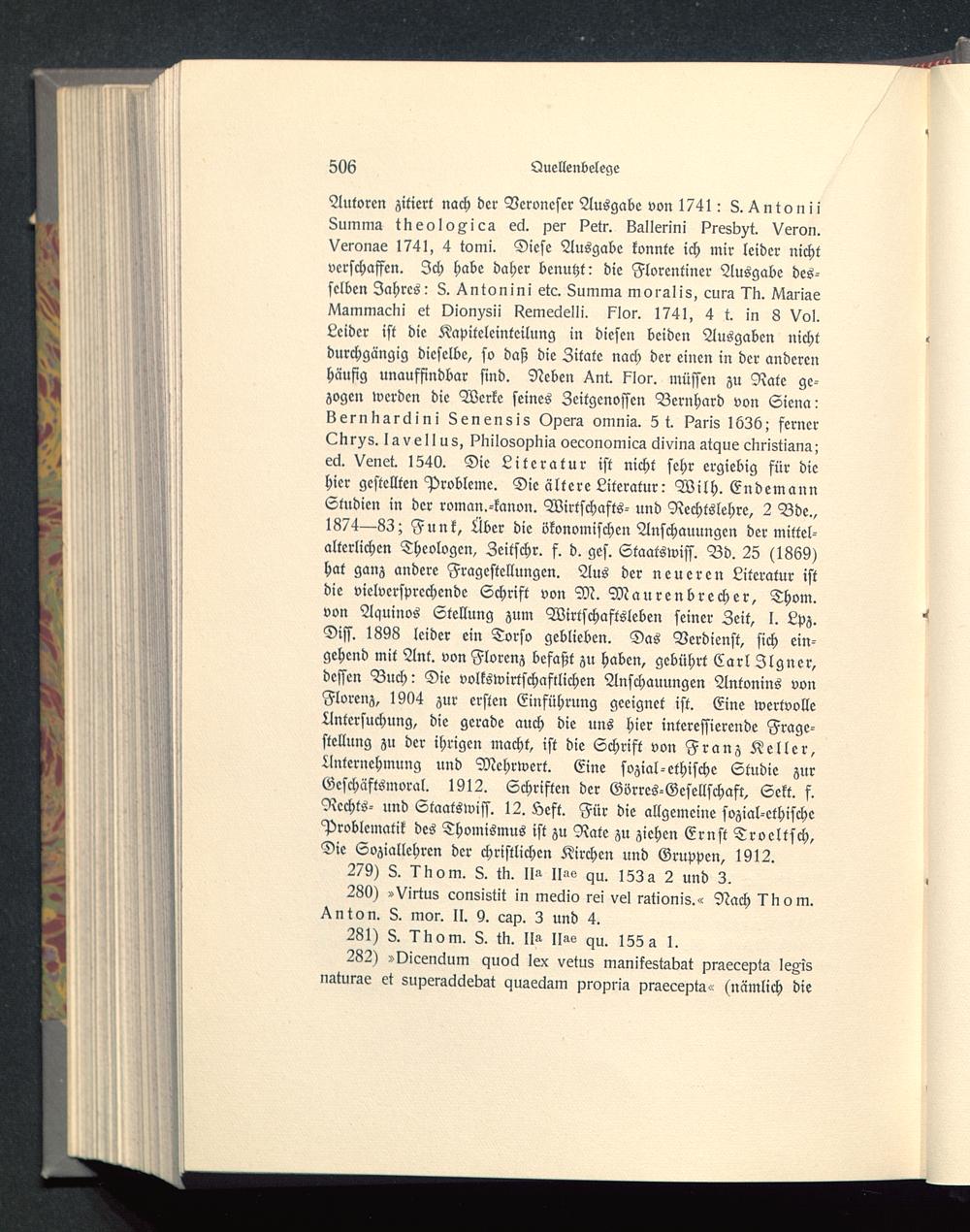 Autoren zitiert nach der Veroneser Ausgabe von 1741: 8. Triton iiSumma tneolo^ica eä. per ?etr. kallerini ?resb^t. Veron.Veronae 1741, 4 tomi. Diese Ausgabe konnte ich mir leider nichtverschaffen. Ich habe daher benutzt: die Florentiner Ausgabe des-selben Jahres: 8. ^ntonini etc. 8umma moialis, cura l'n. ^VlariaejVwmmacki et vion^sii I^emecielli. sslor. 1741, 4 t. in 8 Vol.Leider ist die Kapitelcinteilung in diesen beiden Ausgaben nichtdurchgängig dieselbe, so daß die Zitate nach der einen in der anderenhäufig unauffindbar sind. Neben ^nr. l^Ior. müssen zu Rate ge-zogen werden die Werke seines Zeitgenossen Bernhard von Sicna:IZernnar^ini 8enensis Opera omnia. 5 t. ?aris I63ö; fernerLnr^s. lavell us, ?liilosopliia oeconomica clivina atque enristiana;eä. Venet. 1540. Die Literatur ist nicht sehr ergiebig für diehier gestellten Probleme. Die ältere Literatur: Wilh. EndemannStudien in der roman.-kanon. Wirtschafts- und Nechtslehre, 2 Bde.,1874—83; Funk, Äber die ökonomischen Anschauungen der mittel-alterlichen Theologen, Zeitschr. f. d. ges. Staatswiss. Bd. 25 (1869)hat ganz andere Fragestellungen. Aus der neueren Literatur istdie vielversprechende Schrift von M. Maurenbrecher, Thom.von Aquinos Stellung zum Wirtschaftsleben seiner Zeit, I. Lpz.Diss. 1898 leider ein Torso geblieben. Das Verdienst, sich ein-gehend mit Ant. von Florenz befaßt zu haben, gebührt Carl Ilgner,dessen Buch: Die volkswirtschaftlichen Anschauungen Antonins vonFlorenz , 1904 zur ersten Einführung geeignet ist. Eine wertvolleUntersuchung, die gerade auch die uns hier interessierende Frage-stellung zu der ihrigen macht, ist die Schrift von Franz Keller ,Unternehmung und Mehrwert. Eine sozial-ethische Studie zurGcschäftsmoral. 1912. Schriften der Gvrres-Gesellschast, Sekt. f.Rechts- und Staatswiss. 12. Seft. Für die allgemeine sozial-ethischeProblematik des Thomismus ist zu Rate zu ziehen Ernst Trocltsch,Die Soziallehrcn der christlichen Kirchen und Gruppen, 1912.
