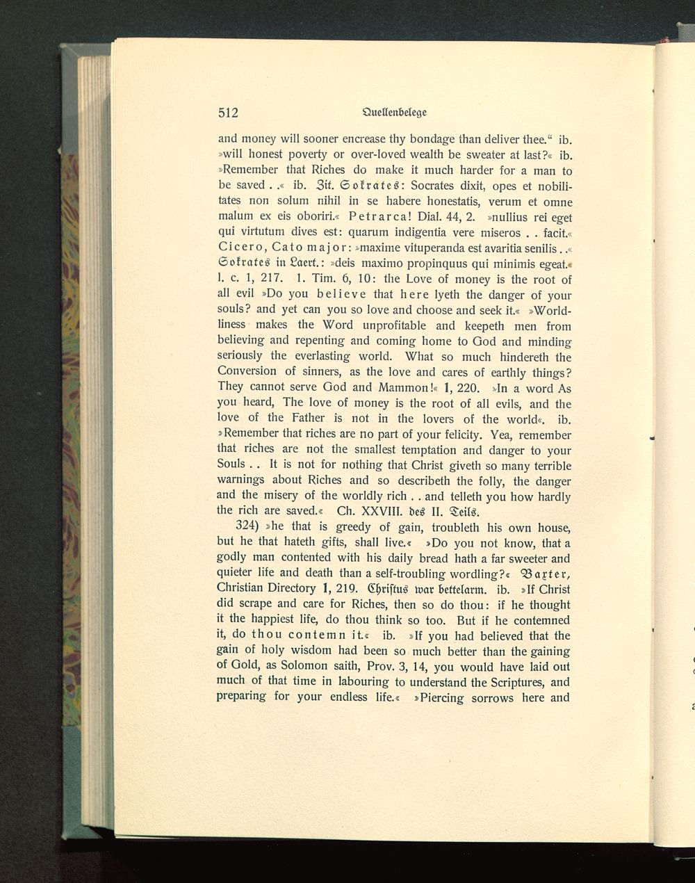 anä monev will sooner encrease tkv bon6a^e tkan cZeliver tkee." ib.»will konest povertv or over-Ioveci wealtk be sweater at lagt?« ib.»pemember tkat dickes äo malce it muck karäer kor a man tobe saveä . .« ib. Zit. Sokrates: Locrates ciixit, opes et nobili-tates non solum nikil in se kabere Konestatis, verum et omnemalum ex eis oboriri.« Petrarca! Oial. 44, 2. »nuliius rei e^etqui virtutum äives est: quarum incliZentia vere miseros. . kacit.«Licerc», Lato major: »maxime vituperancia est avaritia senilis..«Sokrates in Laert.: »c>eis maximo propinczuus qui minimis e^eat.«I. c. I, 217. 1. 1°im. b, tke 1.ove ok monev is tke root okall evil »Oo vou believe tkat kere Ivetk tke äan^er c>k voursouls? anä vet can vou so love anci ckoose anä seel< it.« »Vi^orlä-liness makes tke >Vorci unprokitable anci Iceepetk men krombelieviriA anä repentinA anä cominZ bome tc> (Zc>ä anä minäinAseriouslv tke everlastinZ vvorlä. XVKat so muck Kin6eretk tke(Konversion ok sinners, as tne love anä cares ok eartklv tkinAS?I'kev cannot serve Qoci anci iViammon!« I, 22V. »In a vvorcl ^svon kearä, Ike love ok monev is tne root ok all evils, anci tkelove oi tke k^atker is not in tke lovers ok tne worlci«. ib.--pemember tkat rickes are no part ok vour kelicitv. Vea, remembertkat rickes are not tne smallest temptation anä clanZer to vourLouis . . It is not kor notkinZ tkat Lkrist ^ivetk so manv terriblevvarninAs about Pickes anä so äescribetk tke kollv, tke c-anZeranä tke miserv ok tke worlcilv rick . . anä telletk vou kow karälvtke rick are saveci.« Lk. XXVIII. des II. Teils.