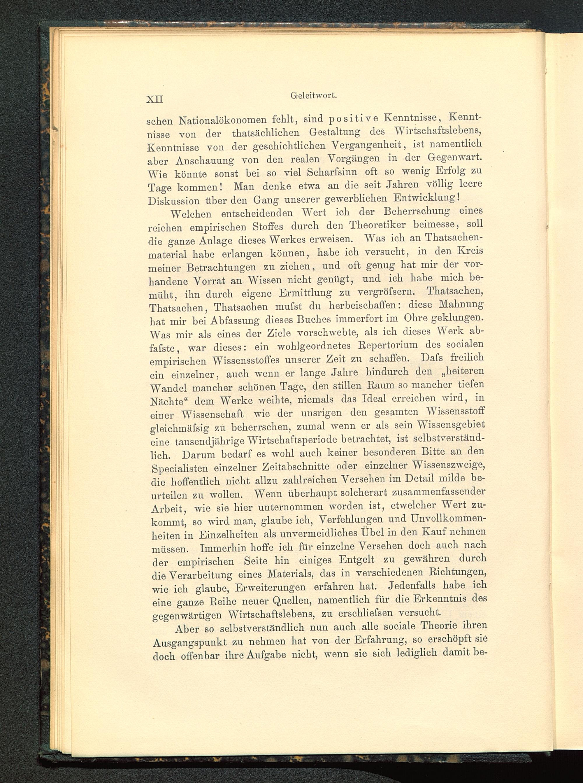 Welchen entscheidenden W r ert ich der Beherrschung einesreichen empirischen Stoffes durch den Theoretiker beimesse, solldie ganze Anlage dieses Werkes erweisen. Was ich an Thatsachen-material habe erlangen können, habe ich versucht, in den Kreismeiner Betrachtungen zu ziehen, und oft genug hat mir der vor-handene Vorrat an Wissen nicht genügt, und ich habe mich be-müht, ihn durch eigene Ermittlung zu vergröfsern. Thatsachen,Thatsachen, Thatsachen mufst du herbeischaffen: diese Mahnunghat mir bei Abfassung dieses Buches immerfort im Ohre geklungen.Was mir als eines der Ziele vorschwebte, als ich dieses Werk ab-fafste, war dieses: ein wohlgeordnetes Repertorium des socialenempirischen Wissensstoffes unserer Zeit zu schaffen. Dafs freilichein einzelner, auch wenn er lange Jahre hindurch den „heiterenW'andel mancher schönen Tage, den stillen Raum so mancher tiefenNächte“ dem W'erke weihte, niemals das Ideal erreichen wird, ineiner Wissenschaft wie der unsrigen den gesamten Wissensstoffgleichmäfsig zu beherrschen, zumal wenn er als sein Wissensgebieteine tausendjährige Wirtschaftsperiode betrachtet, ist selbstverständ-lich. Darum bedarf es wohl auch keiner besonderen Bitte an denSpecialisten einzelner Zeitabschnitte oder einzelner Wissenszweige,die hoffentlich nicht allzu zahlreichen Versehen im Detail milde be-urteilen zu wollen. Wenn überhaupt solcherart zusaramenfassenderArbeit, wie sie hier unternommen worden ist, etwelcher Wert zu-kommt, so wird man, glaube ich, Verfehlungen und Unvollkommen-heiten in Einzelheiten als unvermeidliches Übel in den Kauf nehmenmüssen. Immerhin hoffe ich für einzelne Versehen doch auch nachder empirischen Seite hin einiges Entgelt zu gewähren durchdie Verarbeitung eines Materials, das in verschiedenen Richtungen,wie ich glaube, Erweiterungen erfahren hat. Jedenfalls habe icheine ganze Reihe neuer Quellen, namentlich für die Erkenntnis desgegenwärtigen Wirtschaftslebens, zu erschliefsen versucht.