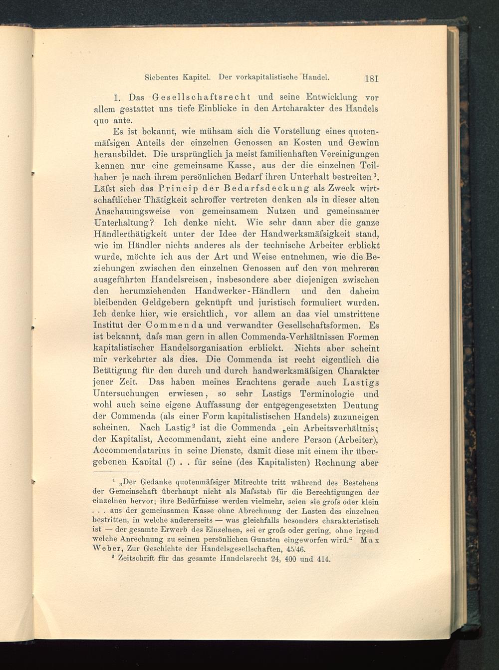 ist bekannt, dafs man gern in allen Commenda-Verhältnissen Formenkapitalistischer Handelsorganisation erblickt. Nichts aber scheintmir verkehrter als dies. Die Commenda ist recht eigentlich dieBetätigung für den durch und durch handwerksmäfsigen Charakterjener Zeit. Das haben meines Erachtens gerade auch LastigsUntersuchungen erwiesen, so sehr Lastigs Terminologie undwohl auch seine eigene Auffassung der entgegengesetzten Deutungder Commenda (als einer Form kapitalistischen Handels) zuzuneigenscheinen. Nach Lästig 2 ist die Commenda „ein Arbeitsverhältnis;der Kapitalist, Accommendant, zieht eine andere Person (Arbeiter),Accommendatarius in seine Dienste, damit diese mit einem ihr über-gebenen Kanital (!) . . für seine (des Kapitalisten) Rechnung aber
