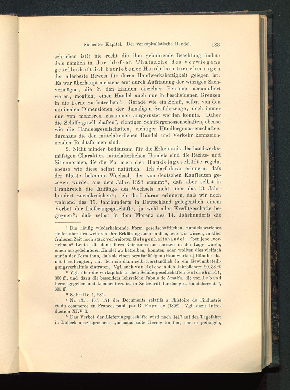 2. Nicht minder bedeutsam für die Erkenntnis des handwerks-mäfsigen Charakters mittelalterlichen Handels sind die Rechts- undSittennormen, die die Formen der Handelsgeschäfte regeln,ebenso wie diese selbst natürlich. Ich darf daran erinnern, dafsder älteste bekannte Wechsel, der von deutschen Kaufleuten ge-zogen wurde, aus dem Jahre 1323 stammt 8 , dafs aber selbst inFrankreich die Anfänge des Wechsels nicht über das 13. Jahr-hundert zurückreichen 4 ; ich darf daran erinnern, dafs wir nochwährend des 15. Jahrhunderts in Deutschland gelegentlich einemVerbot der Lieferungsgeschäfte, ja wohl aller Kreditgeschäfte be-gegnen 5 * ; dafs selbst in dem Florenz des 14. Jahrhunderts die