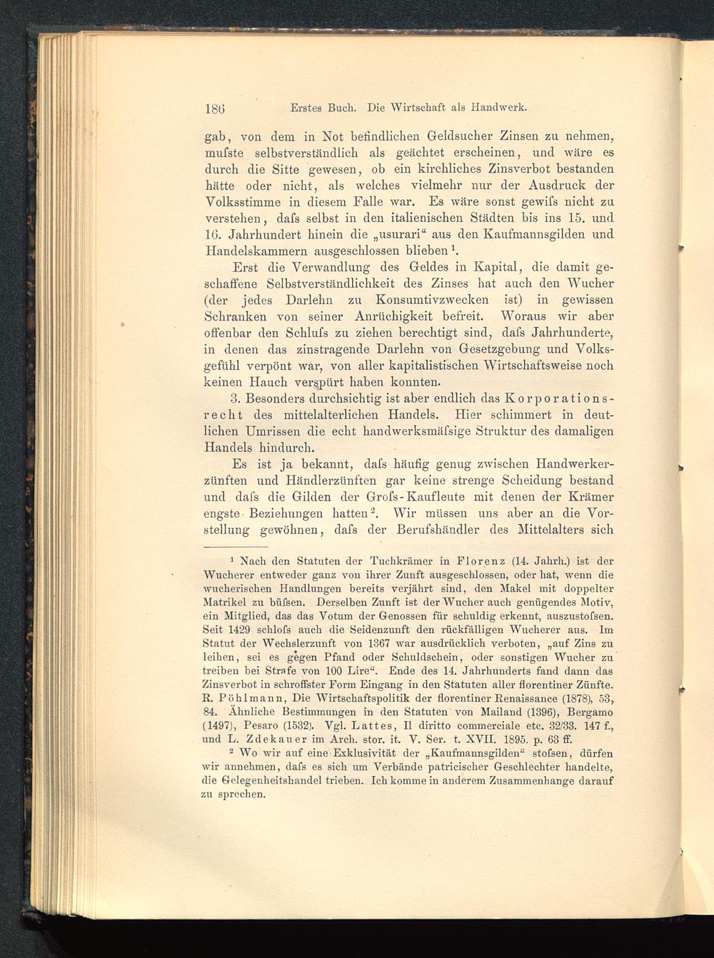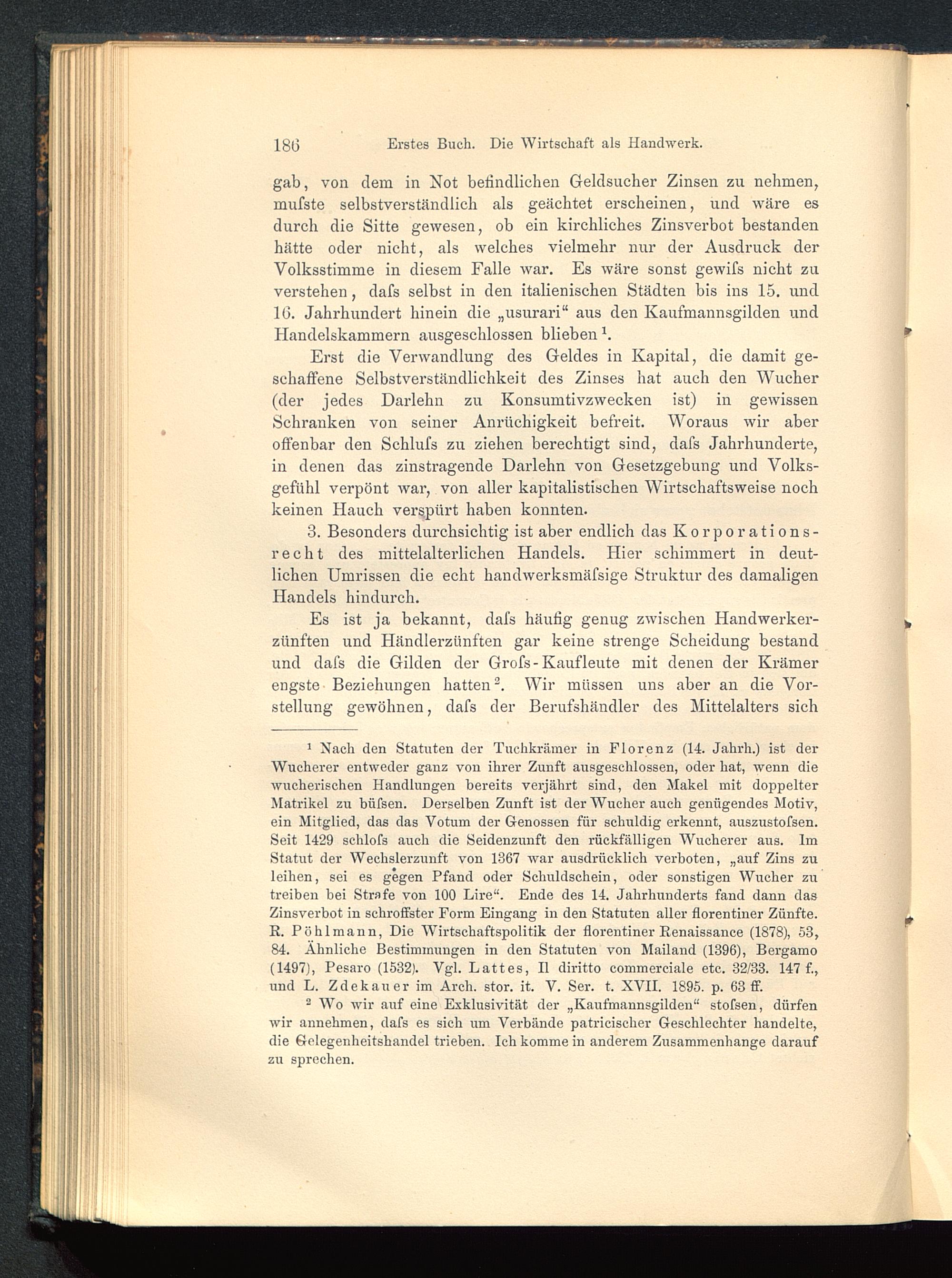 gab, von dem in Not befindlichen Geldsucher Zinsen zu nehmen,mufste selbstverständlich als geächtet erscheinen, und wäre esdurch die Sitte gewesen, ob ein kirchliches Zinsverbot bestandenhätte oder nicht, als welches vielmehr nur der Ausdruck derYolksstimme in diesem Falle war. Es wäre sonst gewifs nicht zuverstehen, dafs selbst in den italienischen Städten bis ins 15. und10. Jahrhundert hinein die „usurari“ aus den Kaufmannsgilden undHandelskammern ausgeschlossen blieben h