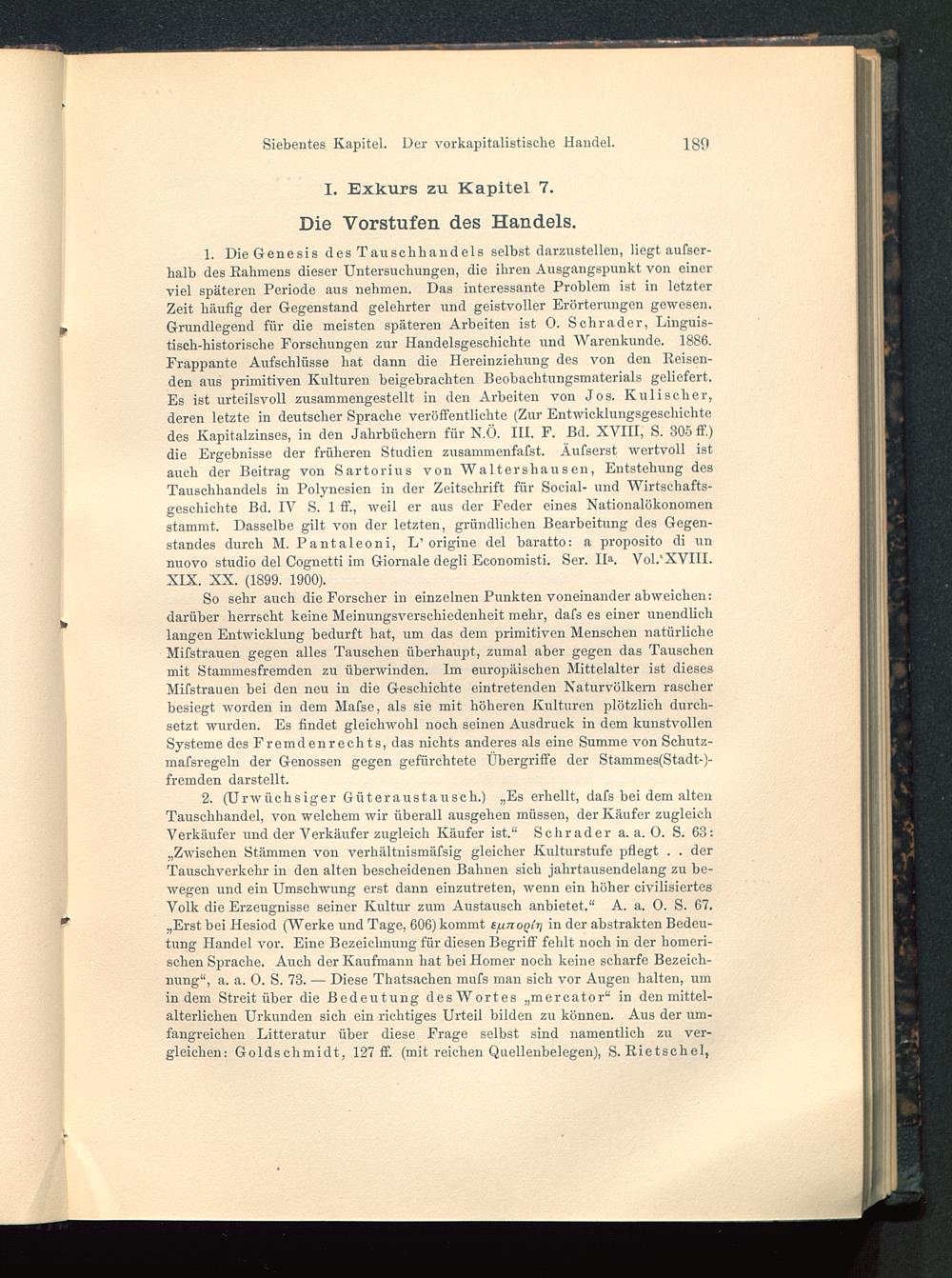 2. (Urwüchsiger Güteraustausch.) „Es erhellt, dafs bei dem altenTauschhandel, von welchem wir überall ausgehen müssen, der Käufer zugleichVerkäufer und der Verkäufer zugleich Käufer ist.“ Schräder a. a. O. S. 63:„Zwischen Stämmen von verhältnismäfsig gleicher Kulturstufe pflegt . . derTauschverkehr in den alten bescheidenen Bahnen sich jahrtausendelang zu be-wegen und ein Umschwung erst dann einzutreten, wenn ein höher civilisiertesVolk die Erzeugnisse seiner Kultur zum Austausch anbietet.“ A. a. 0. S. 67.„Erst bei Hesiod (Werke und Tage, 606) kommt efinog in der abstrakten Bedeu-tung Handel vor. Eine Bezeichnung für diesen Begriff fehlt noch in der homeri-schen Sprache. Auch der Kaufmann hat bei Homer noch keine scharfe Bezeich-nung“, a. a. 0. S. 73. — Diese Thatsachen mufs man sich vor Augen halten, umindem Streit über die Bedeutung des Wortes „mercator“ in den mittel-alterlichen Urkunden sich ein richtiges Urteil bilden zu können. Aus der um-fangreichen Litteratur über diese Frage selbst sind namentlich zu ver-gleichen: Goldschmidt, 127 ff. (mit reichen Quellenbelegen), S. Rietschel,