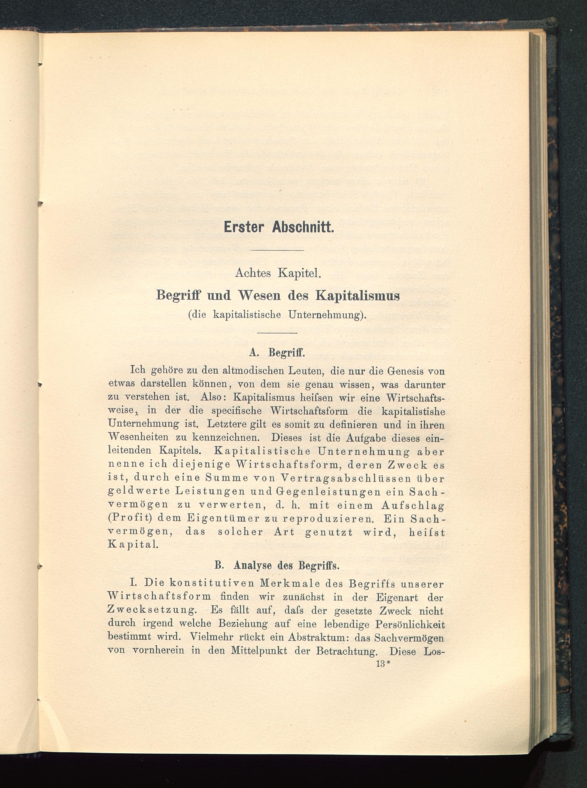 I. Die konstitutiven Merkmale des Begriffs unsererWirtschaftsform finden wir zunächst in der Eigenart derZwecksetzung. Es fällt auf, dafs der gesetzte Zweck nichtdurch irgend welche Beziehung auf eine lebendige Persönlichkeitbestimmt wird. Vielmehr rückt ein Abstraktum: das Sachvermögenvon vornherein in den Mittelpunkt der Betrachtung. Diese Los-