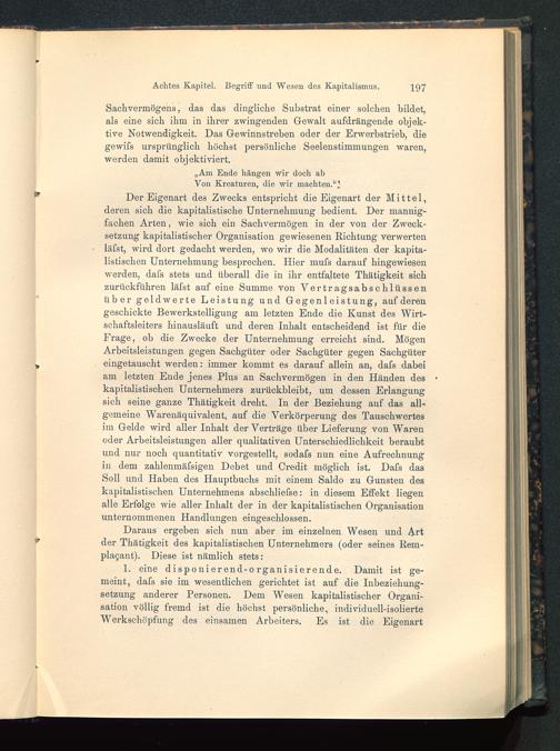 Der Eigenart des Zwecks entspricht die Eigenart der Mittel,deren sich die kapitalistische Unternehmung bedient. Der mannig-fachen Arten, wie sich ein Sachvennögen in der von der Zweck-setzung kapitalistischer Organisation gewiesenen Richtung verwertenläfst, wird dort gedacht werden, wo wir die Modalitäten der kapita-listischen Unternehmung besprechen. Hier mufs darauf hingewiesenwerden, dafs stets und überall die in ihr entfaltete Thätigkeit sichzurückführen läfst auf eine Summe von Vertragsabschlüssenüber geldwerte Leistung und Gegenleistung, auf derengeschickte Bewerkstelligung am letzten Ende die Kunst des Wirt-schaftsleiters hinausläuft und deren Inhalt entscheidend ist für dieFrage, ob die Zwecke der Unternehmung erreicht sind. MögenArbeitsleistungen gegen Sachgüter oder Sachgüter gegen Sachgütereingetauscht werden: immer kommt es darauf allein an, dafs dabeiam letzten Ende jenes Plus an Sachvermögen in den Händen deskapitalistischen Unternehmers zurückbleibt, um dessen Erlangungsich seine ganze Thätigkeit dreht. In der Beziehung auf das all-gemeine Warenäquivalent, auf die Verkörperung des Tauschwertesim Gelde wird aller Inhalt der Verträge über Lieferung von Warenoder Arbeitsleistungen aller qualitativen Unterschiedlichkeit beraubtund nur noch quantitativ vorgestellt, sodafs nun eine Aufrechnungin dem zahlenmäfsigen Debet und Credit möglich ist. Dafs dasSoll und Haben des Hauptbuchs mit einem Saldo zu Gunsten deskapitalistischen Unternehmens abschliefse: in diesem Effekt liegenalle Erfolge wie aller Inhalt der in der kapitalistischen Organisationunternommenen Handlungen eingeschlossen.