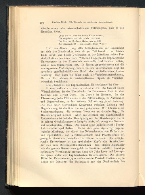 2. eine kalkulatorisch-spekulative. Das Symbol dieserWirtschaftsform ist das Hauptbuch: ihr Lebensnerv liegt in demGewinn- und Verlust-Conto. Im Conto: im Rechnen. In derÜbersetzung jedes Phänomens in das Ziffernmäfsige, im Aufrechnenund Gegenrechnen, in der nackten Geldwertung jeder Leistung.Die Idee einer notwendigen Kongruenz zwischen Leistung undGegenleistung ist damit in die Welt gekommen. Wir können dieseSeelenveranlagung, die solchem Verhalten zu Grunde liegt, dieRechenhaftigkeit nennen. Aber das Rechnen des kapitalistischen Unternehmers ist bei der Mannigfaltigkeit der Beziehungen, die erin seinem Geschäftsinteresse knüpfen mufs, oft genug ein Rechnenmit unbekannten Gröfsen. Das macht seine kalkulatorische Thätig-keit zu einer spekulativen. Es ist eine ganz eigenartige psycho-logische Mischung, die durch das Nebeneinander von Kalkulationund Spekulation, von Verstandesschärfe und Phantasiefülle oftgenug in einem und demselben Individuum entsteht. Der schöpfe-rische Unternehmer ist der spekulative Kopf: der Synthetik er,der sich zum Durchschnittsuntei-nehmer, dem blofsen Kalkulatorwie der geniale Denker zum gelehrten Routinier verhält. Einseitigespekulative Veranlagung erzeugt dann die John Laws und Lesseps: die Byron unter den kapitalistischen Unternehmern. Die höchsteBlüte des Unternehmertypus stellen solche Persönlichkeiten dar, indenen die Genialität der Spekulation mit der Nüchternheit des
